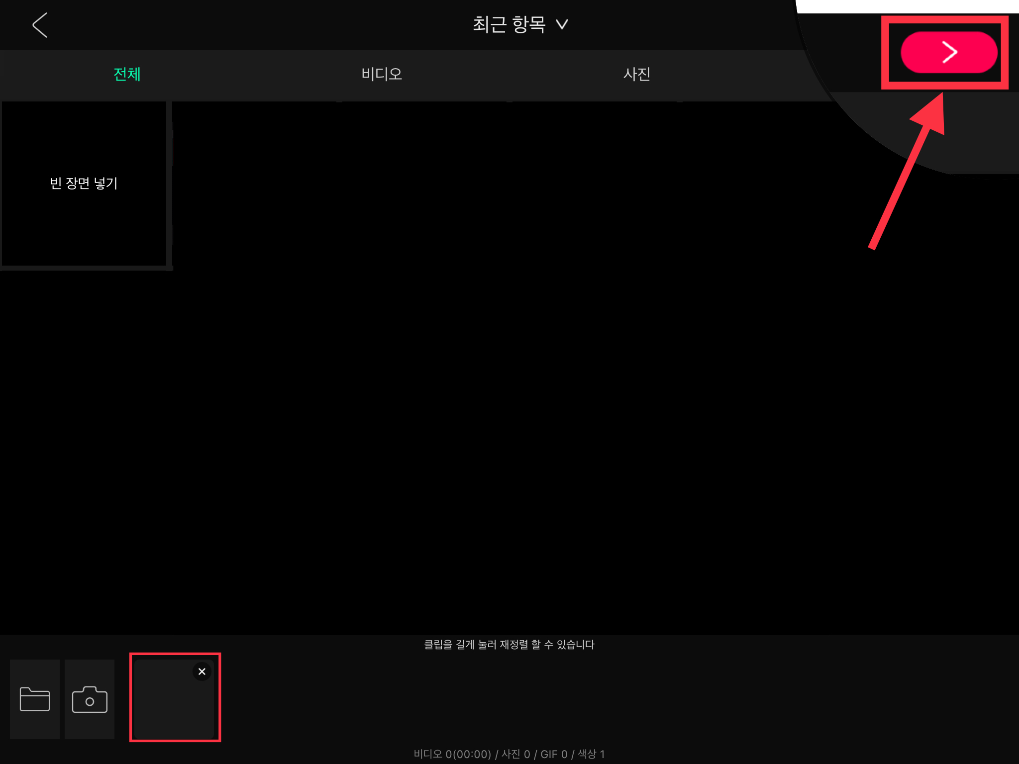 ▼ 그리고 [빈 장면 넣기]를 선택하고, 오른쪽 상단의 빨간색 완료 버튼을 눌러 주세요.