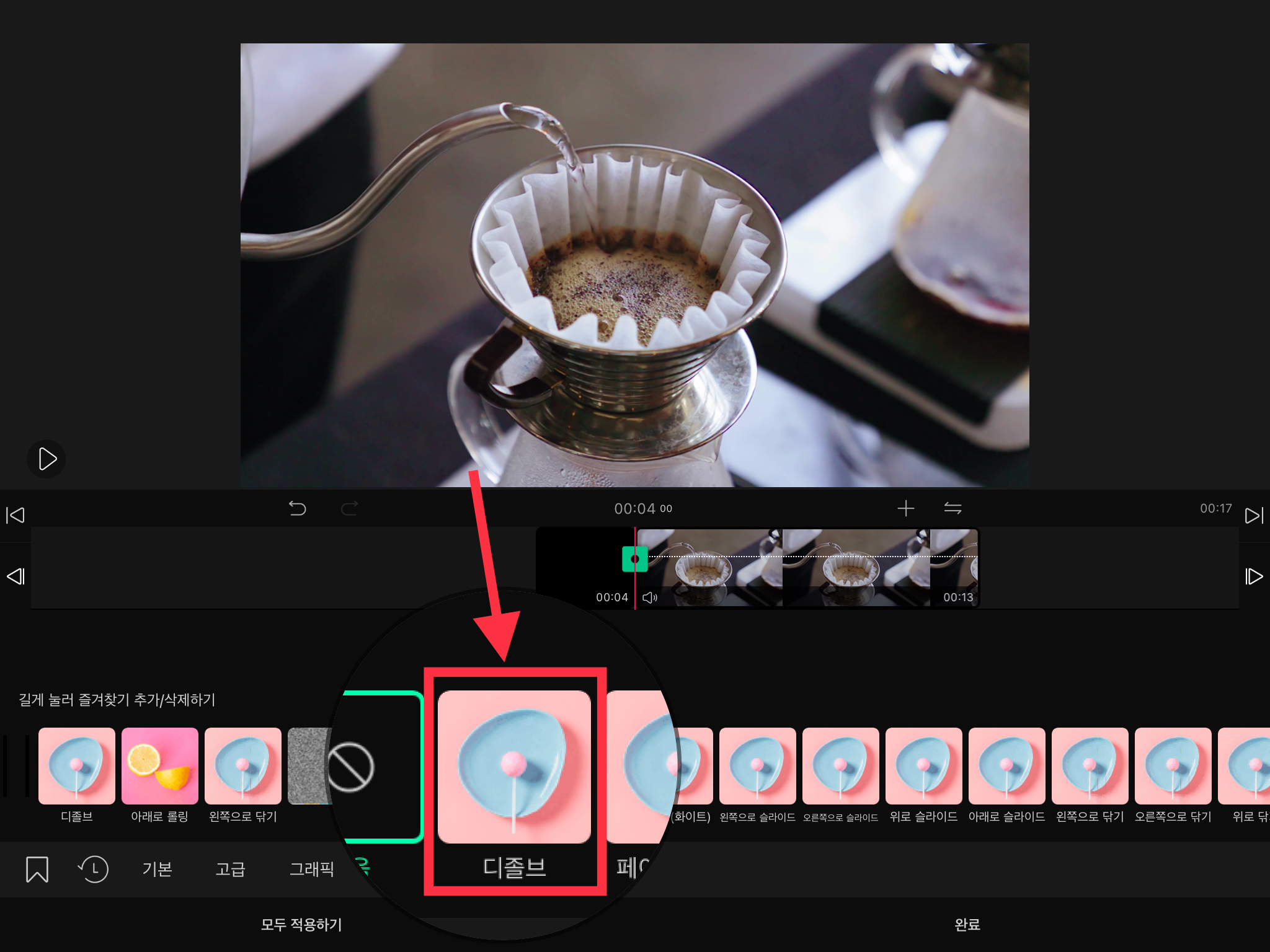 ▼ 아래와 같이 화면 전환 종류들이 나타납니다. 여기서 [디졸브]를 선택합니다. (디졸브는 영상과 영상이 서서히 겹치면서 전환되는 트랜지션 입니다)