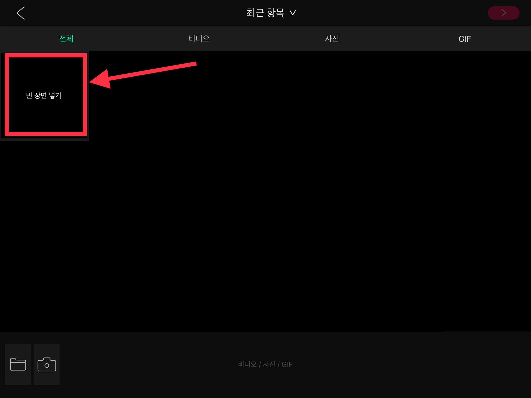 ▼ 그리고 [빈 장면 넣기]를 선택하고, 오른쪽 상단의 빨간색 완료 버튼을 눌러 주세요.