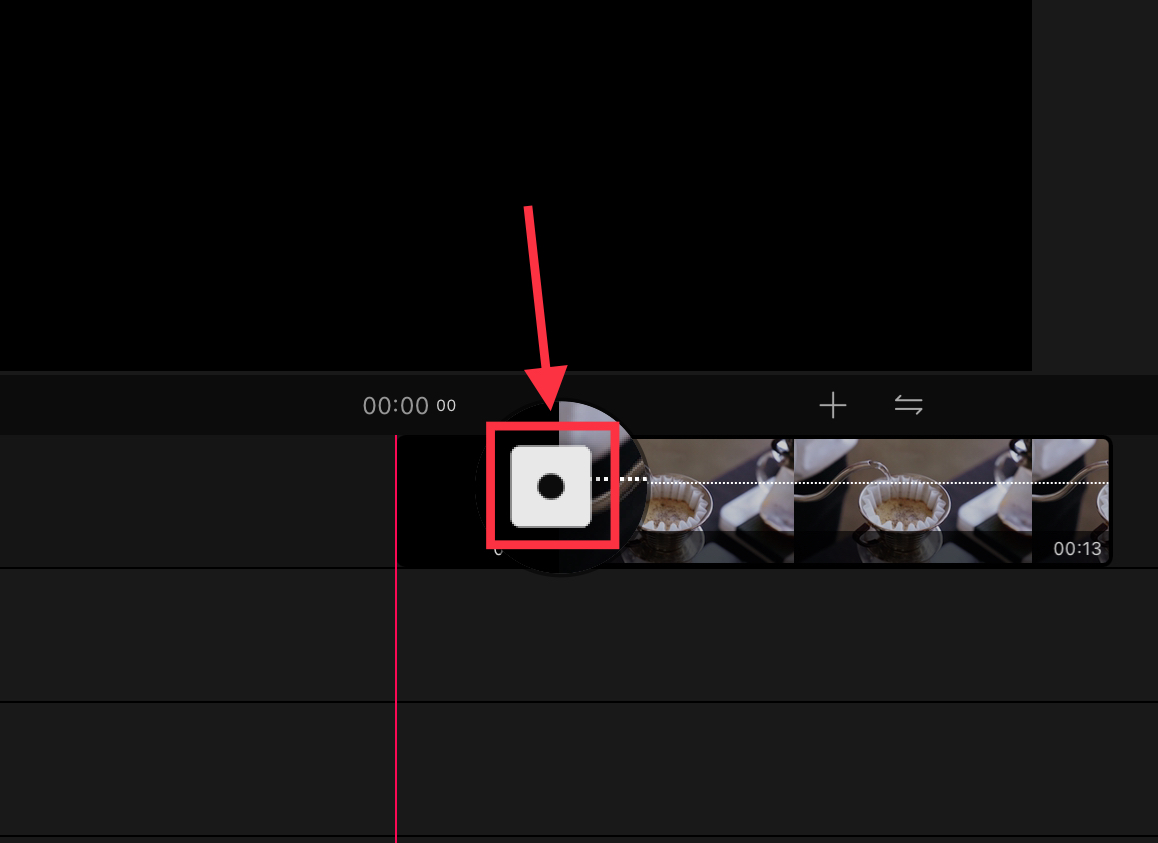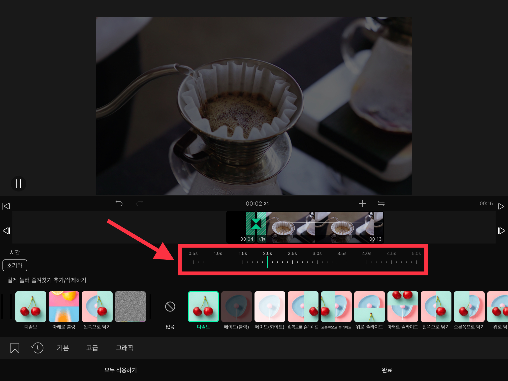 ▼ 검은색 화면과 영상 사이에 있는 네모난 박스에 점이 들어있는 아이콘을 클릭합니다. (트랜지션 아이콘 입니다.)