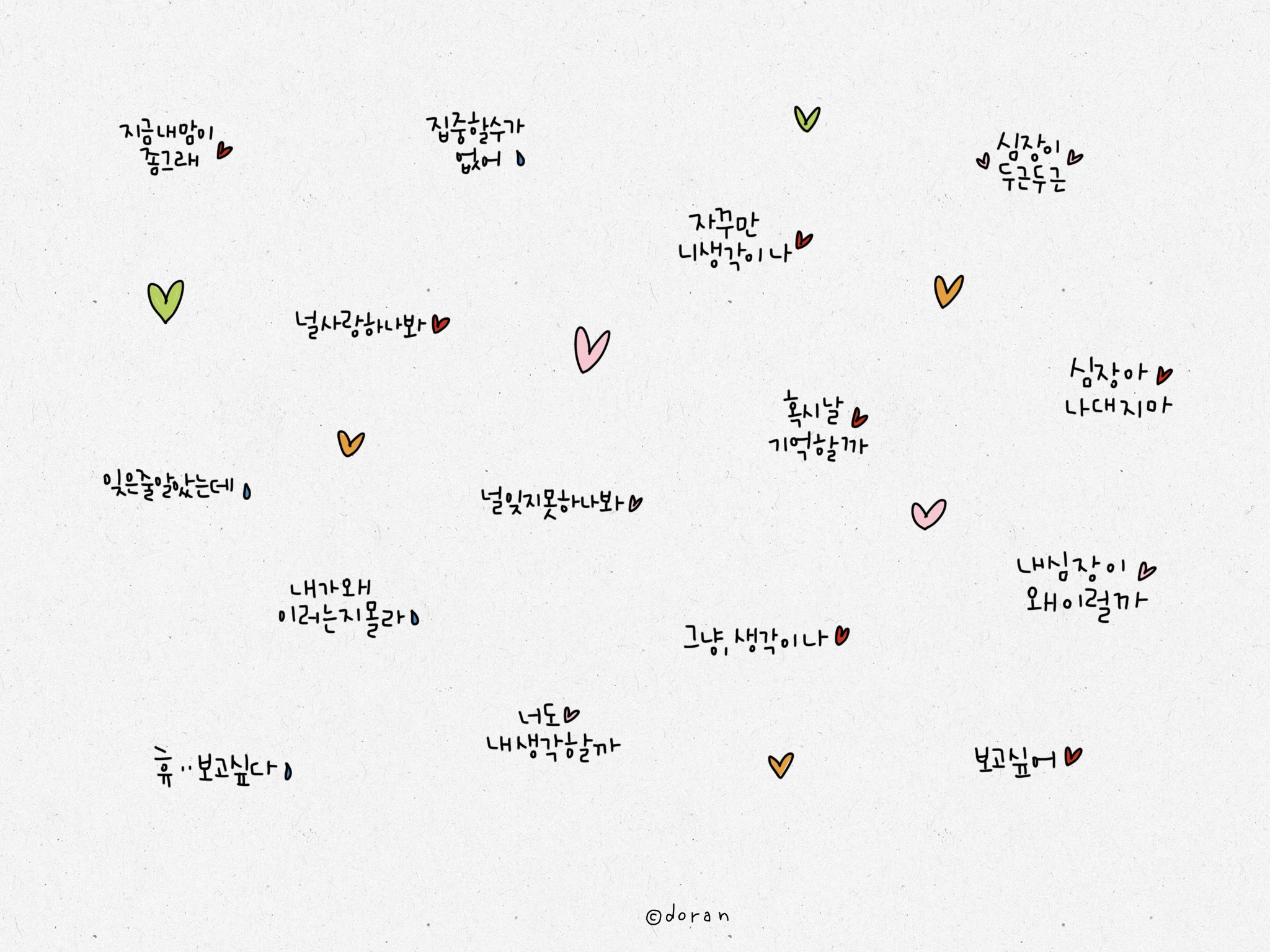 안녕하세요 도란입니다. 오늘은 좀 간지러울지 모르는 사랑에 관한 글귀 스티커를 가지고 왔습니다. :) 두근두근 설레는 노래를 들으며 스티커를 만들다 보니 저절로 이런 글이 나오더라고요 ㅎㅎ 지금 보니 간지러우면서도 괜히 맘이 설레고 또 그러네요.