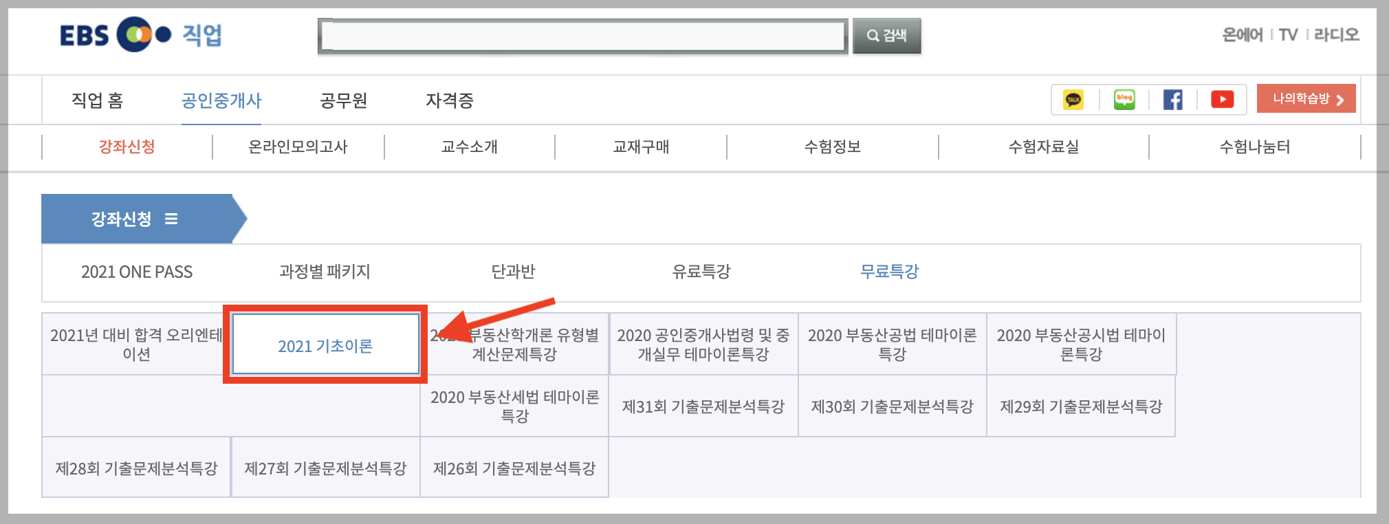 ▼ 무료인강으로 들어가면 다양한 무료 강의들이 나오는데요. 그중에서 [2021 기초이론]을 선택합니다.