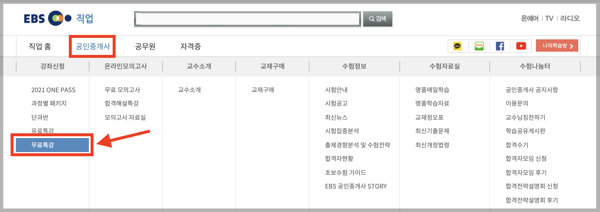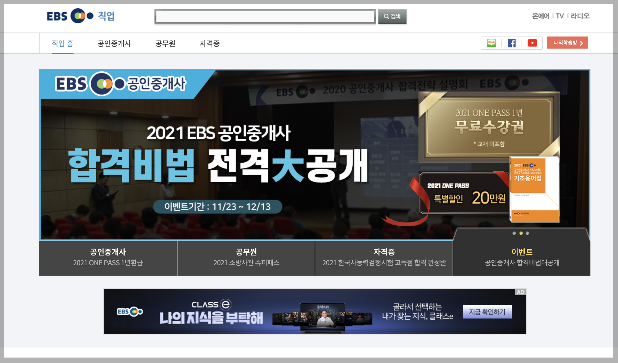 ▼ 공인중개사 무료인강을 들을 수 있는 [ebs직업 공인중개사] 입니다. 공인중개사뿐만 아니라 공무원 시험과 자격증 시험 강의도 기초강의를 무료로 들을 수 있습니다. (기초 강의를 제외한 심화 강의들은 유료입니다.)