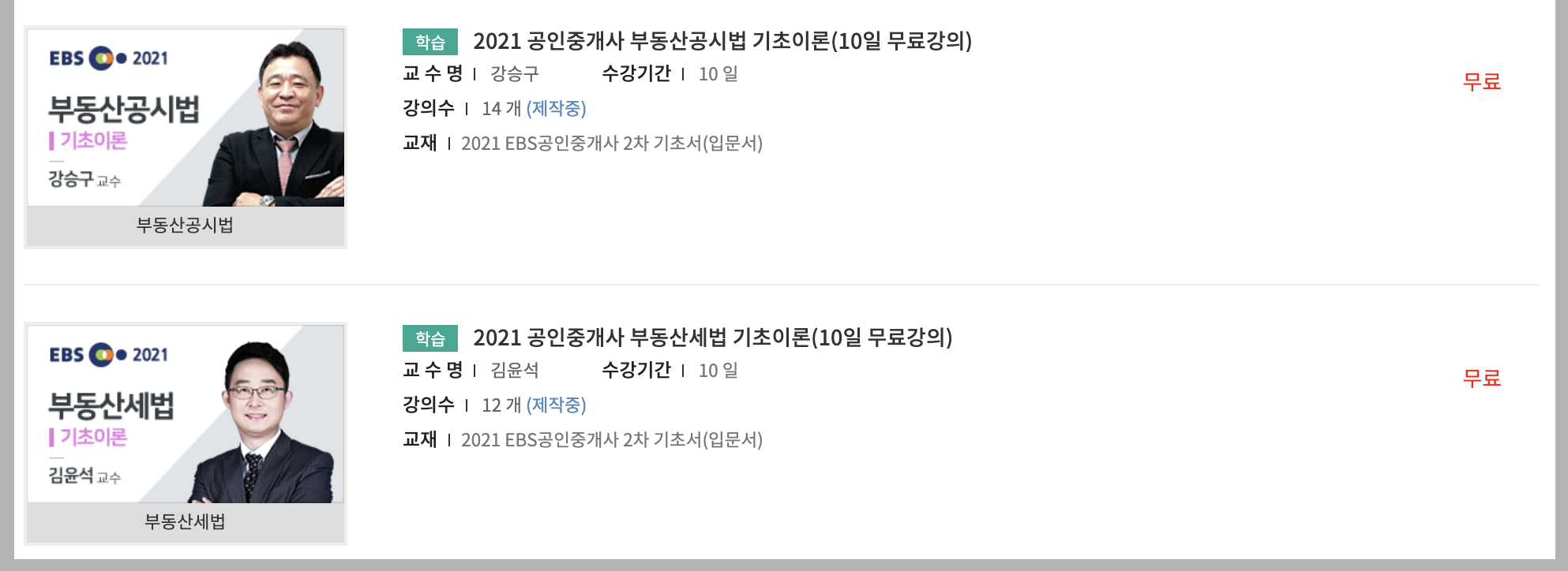 ▼ 공인중개사 무료인강 기초서 교재는 따로 구매를 해야 합니다. [공인중개사] - [교재구매] - [기초서]로 들어가면 '2021년 EBS 공인중개사 1,2차 기초서(2권)'을 구매할 수 있습니다.