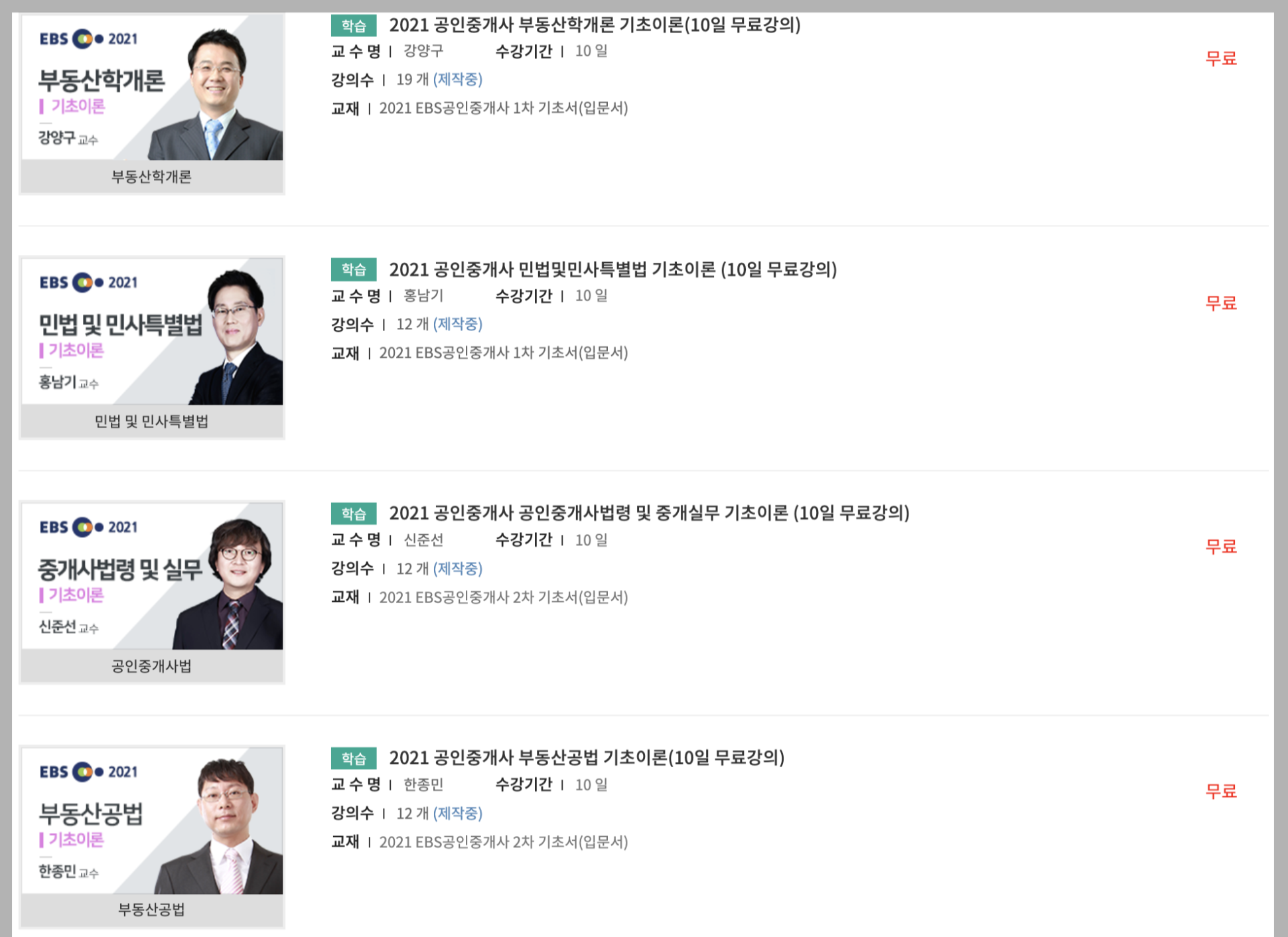 ▼ 공인중개사 시험 전과목 기초 강의를 아래와 같이 무료로 들을 수 있습니다. 무료로 들을 수 있는 기간은 각 강의마다 10일입니다. 10일이면 기초이론을 한번 정도 간단히 훑어볼 수 있습니다.
