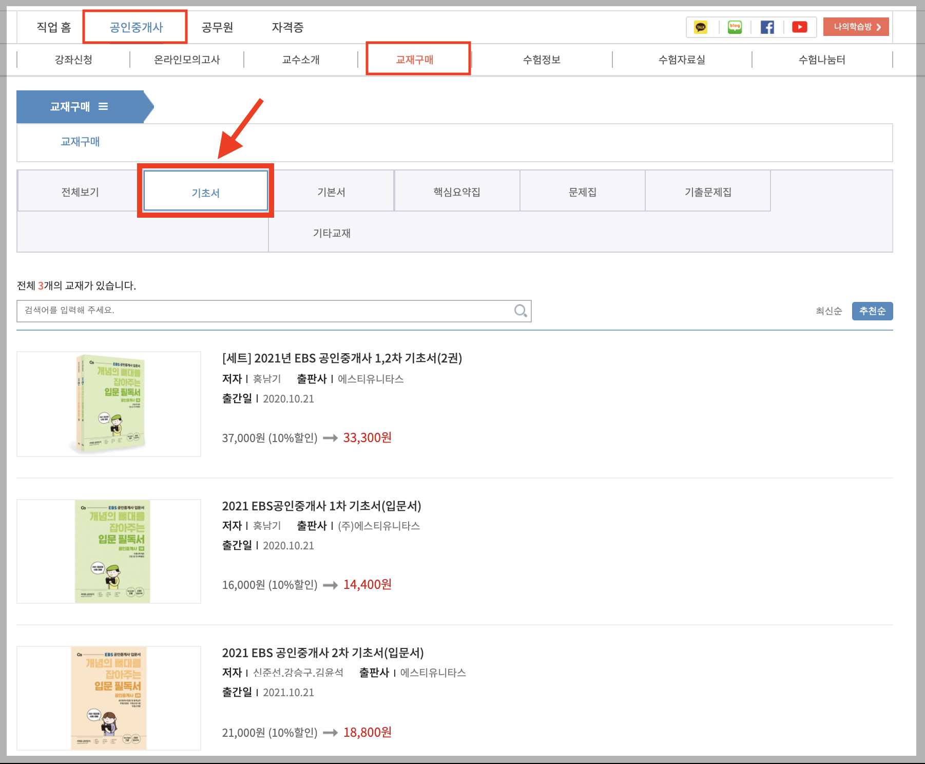 ▼ 공인중개사 무료인강 기초서 교재는 따로 구매를 해야 합니다. [공인중개사] - [교재구매] - [기초서]로 들어가면 '2021년 EBS 공인중개사 1,2차 기초서(2권)'을 구매할 수 있습니다.