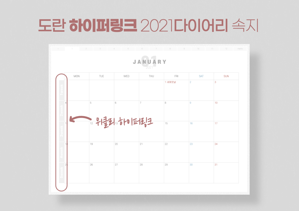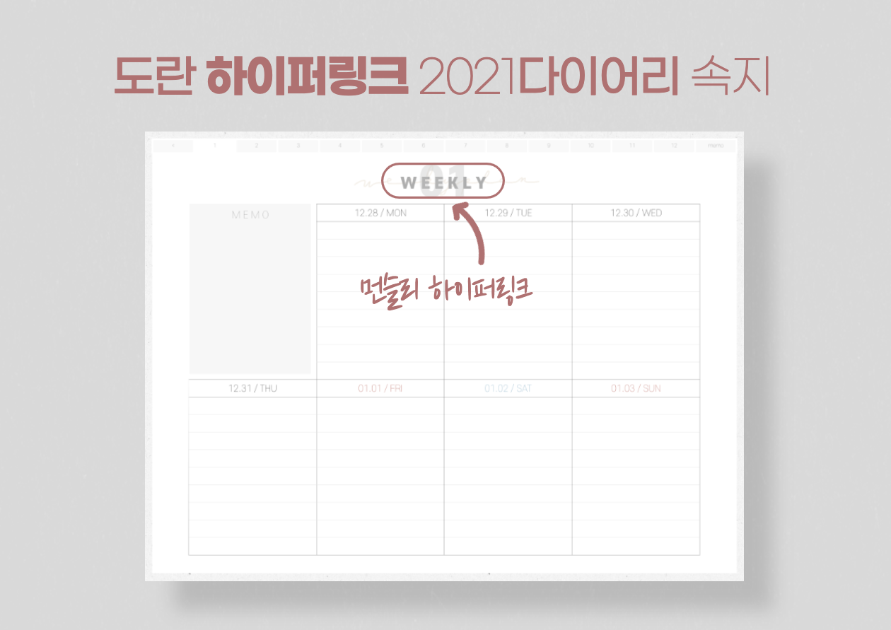 제가 평소 공유하던 다이어리와 구성은 같습니다. 먼슬리와 위클리로 구성되어 있습니다. 가장 앞쪽에는 표지가 있고 가장 마지막에는 메모장이 3페이지 들어가 있습니다. 그리고 도란 2021 하이퍼링크 다이어리는 [월요일 시작]입니다. 일요일 시작 다이어리는 아직 계획이 없습니다.