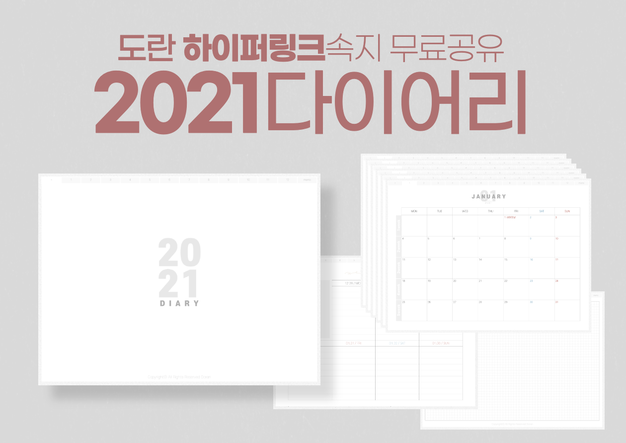 안녕하세요 도란입니다. 오늘은 굿노트 2021 하이퍼링크 다이어리 속지를 공유하려고 합니다. 매월마다 업로드하는 월간 다이어리를 많은 분들이 이용해주셔서 2021년 버전을 한꺼번에 가지고 왔습니다 :) 다운로드 파일은 페이지 가장 하단에 있습니다.