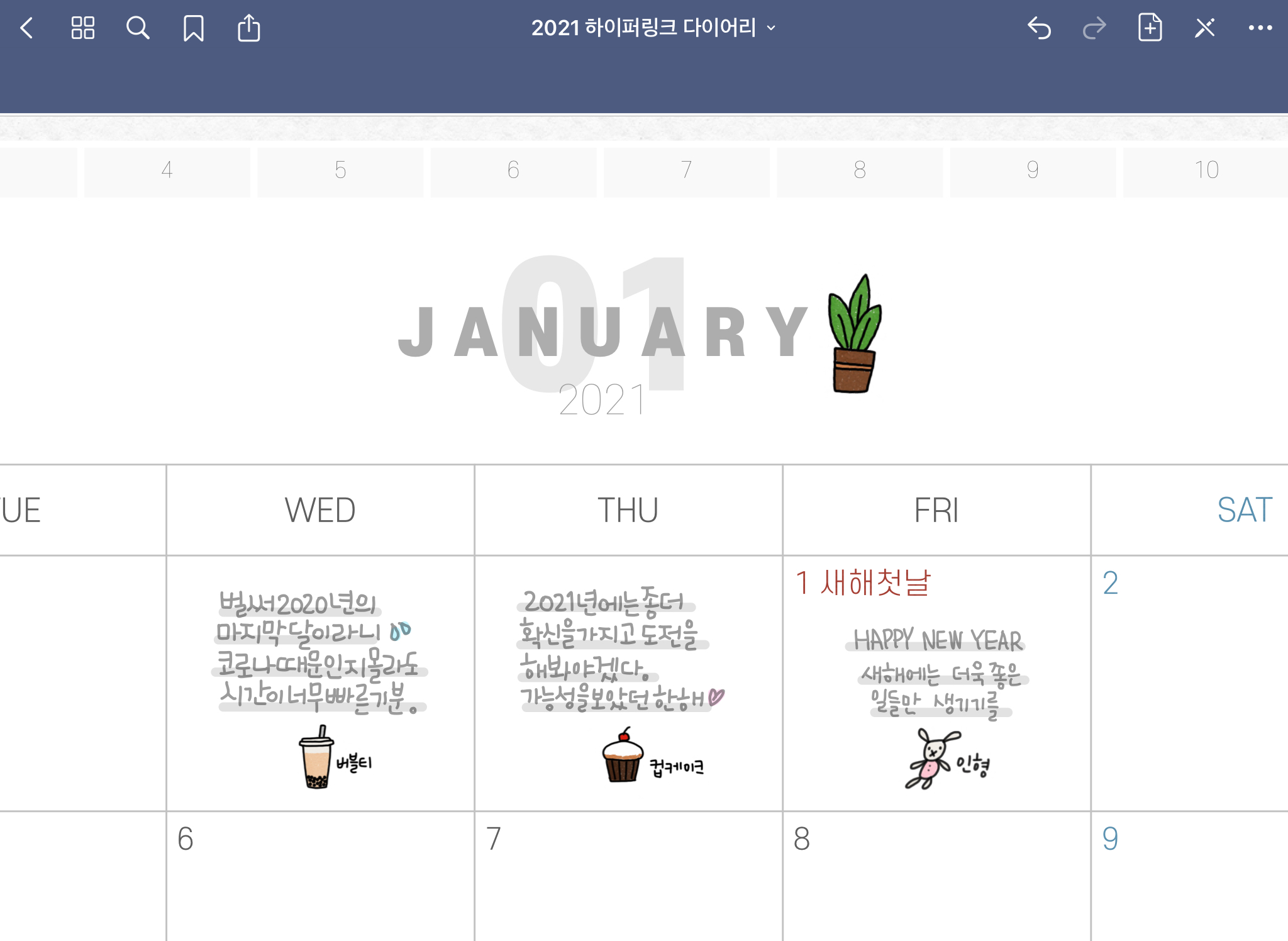 어제 공유한 굿노트 2021 하이퍼링크 다이어리에 스티커를 꾸며주었어요. 다이어리 중간에 조금씩 넣어주니 귀여운 것 같습니다.