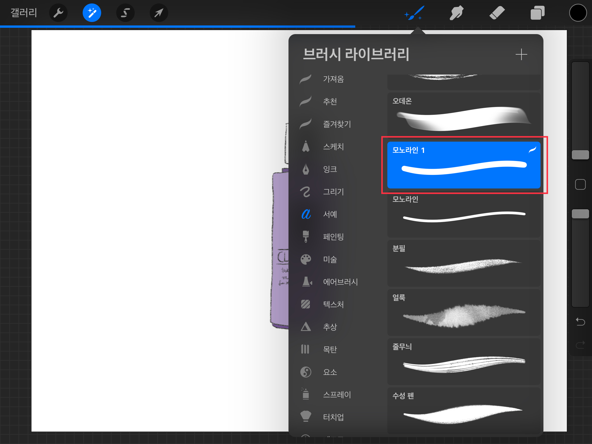 ▼ 브러시 버튼이 반짝이는 브러시로 바뀌며, 흐리게 만들어 줄 브러시 모양을 선택합니다.