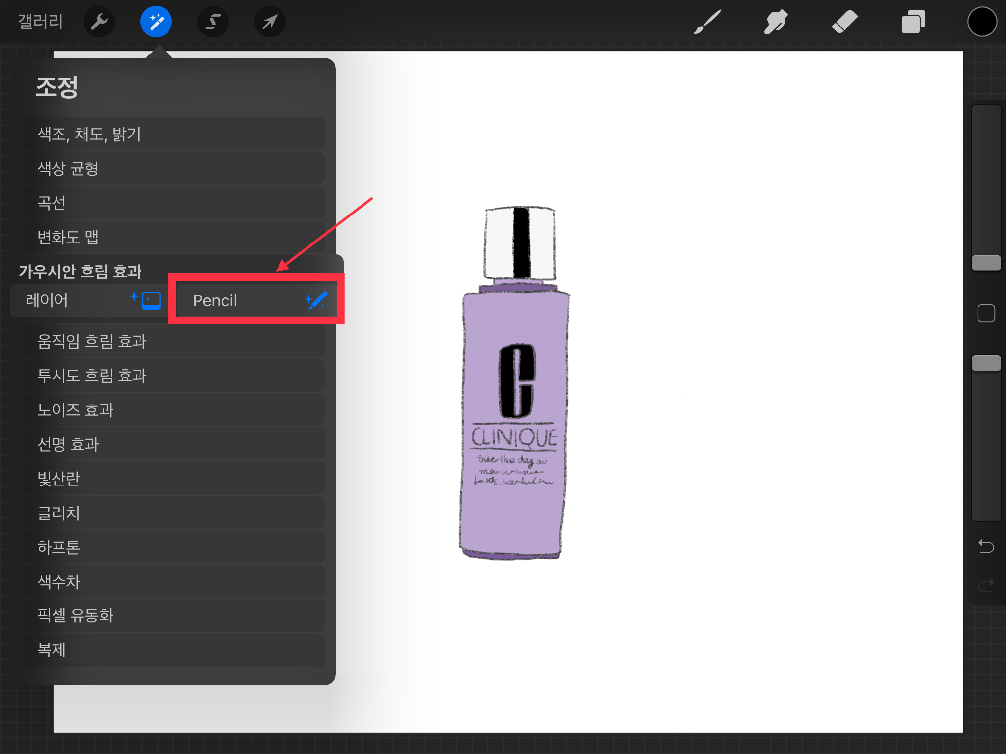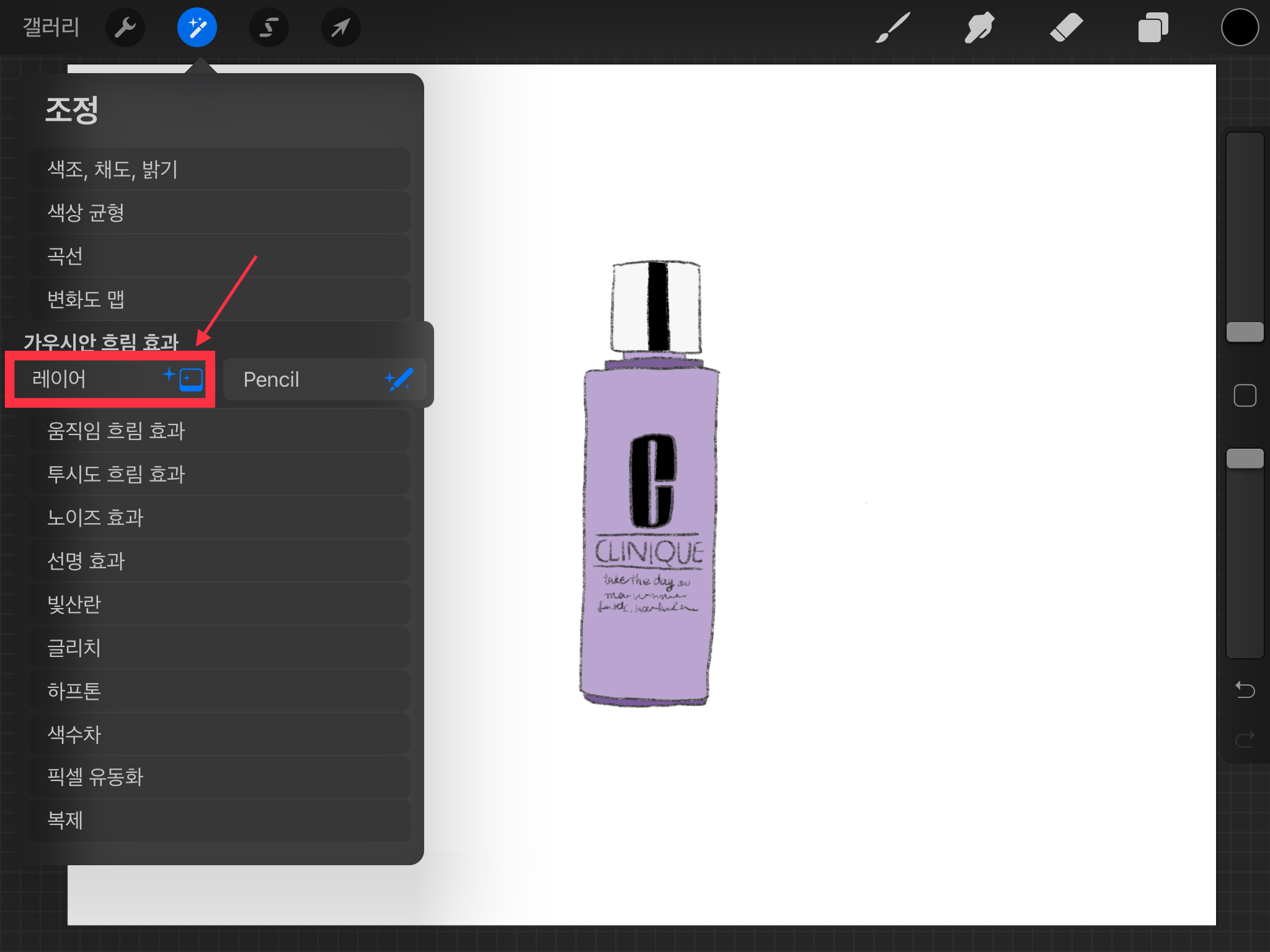 ▼ 왼쪽 상단의 요술봉 그림이 그려져 있는 [조정] 버튼을 누릅니다. [가우시안 흐림 효과]를 선택하면 레이어와 펜슬 중에 고를 수 있습니다.