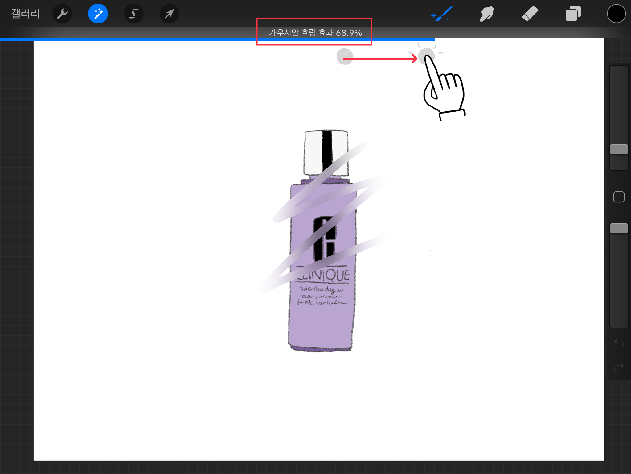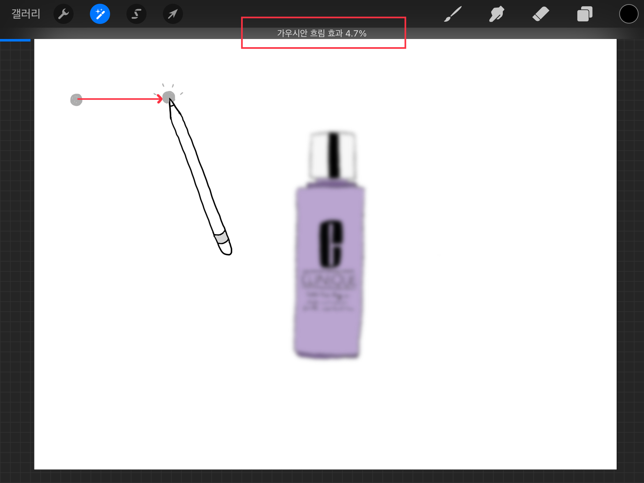 ▼ 아래와 같이 펜을 이용해서 지그재그로 움직여 보면 펜슬이 지나간 부분만 가우시안 블러 처리가 된 것을 알 수 있습니다.