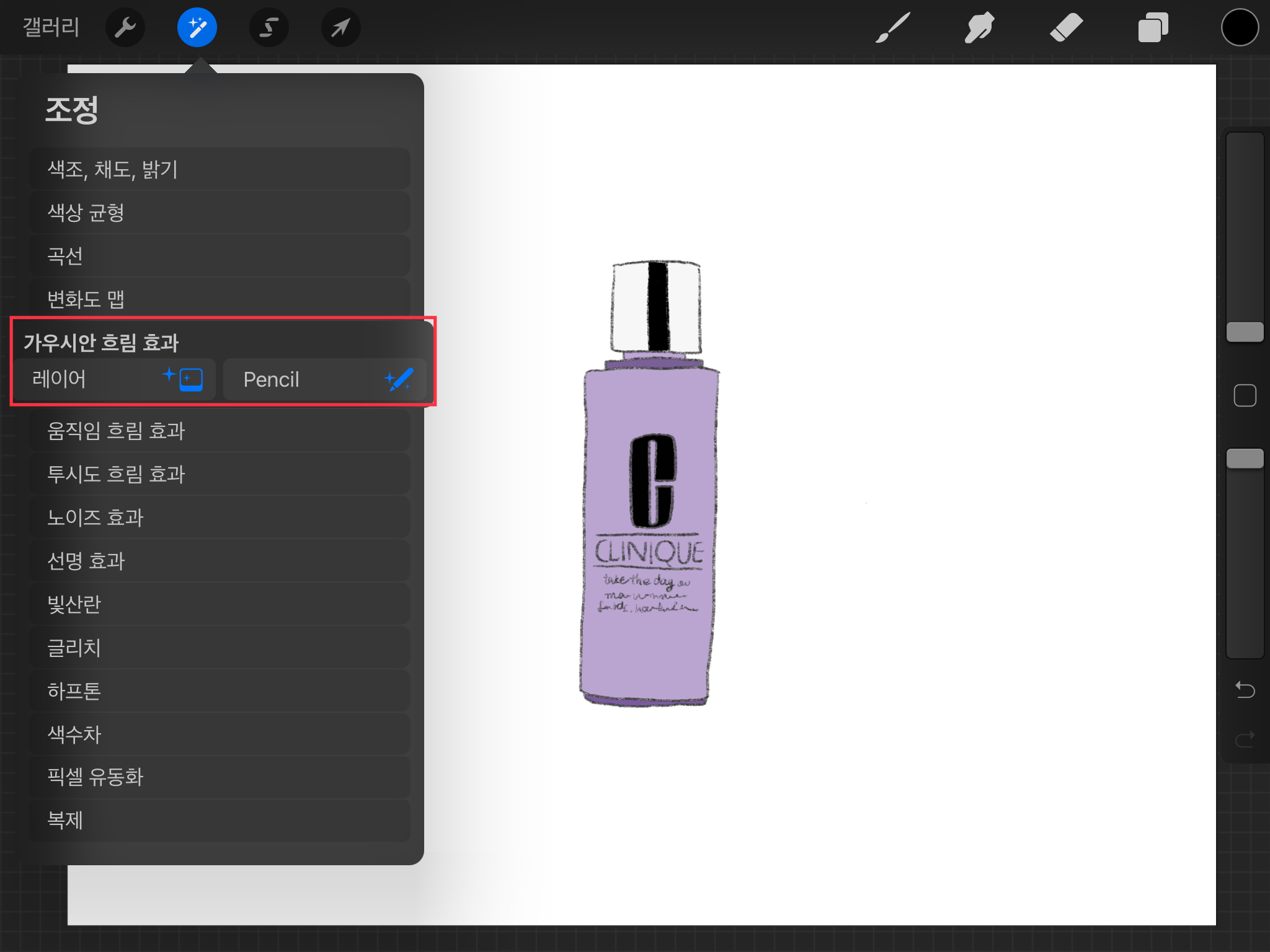 ▼ 왼쪽 상단의 요술봉 그림이 그려져 있는 [조정] 버튼을 누릅니다. [가우시안 흐림 효과]를 선택하면 레이어와 펜슬 중에 고를 수 있습니다.