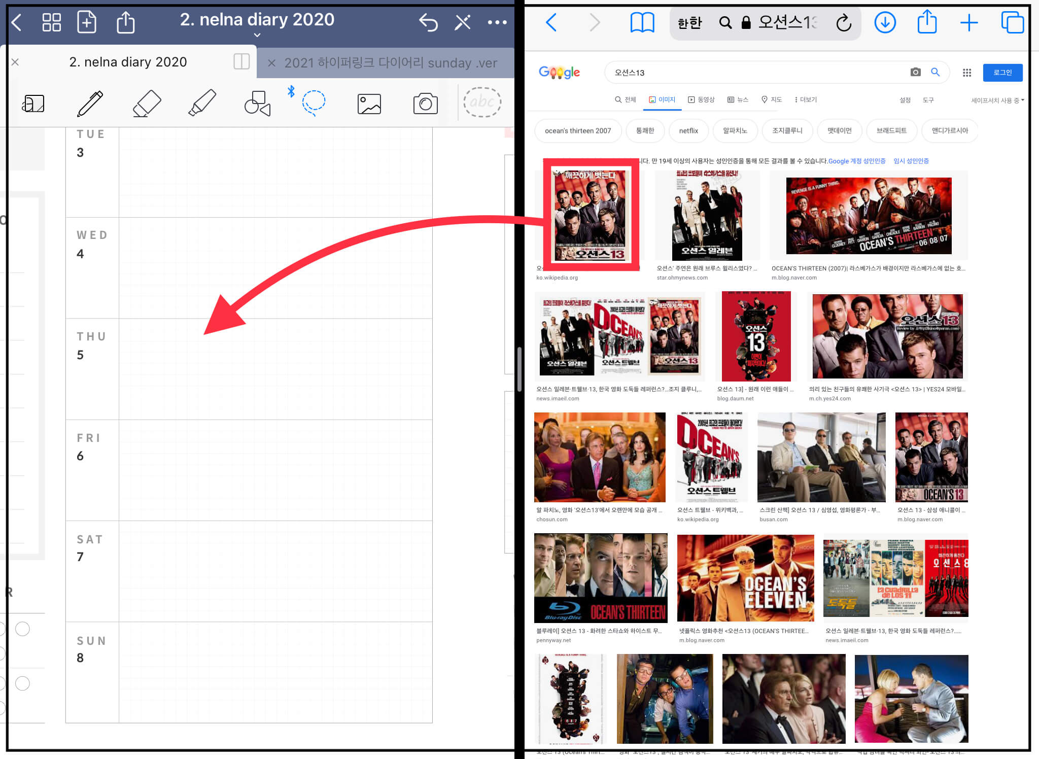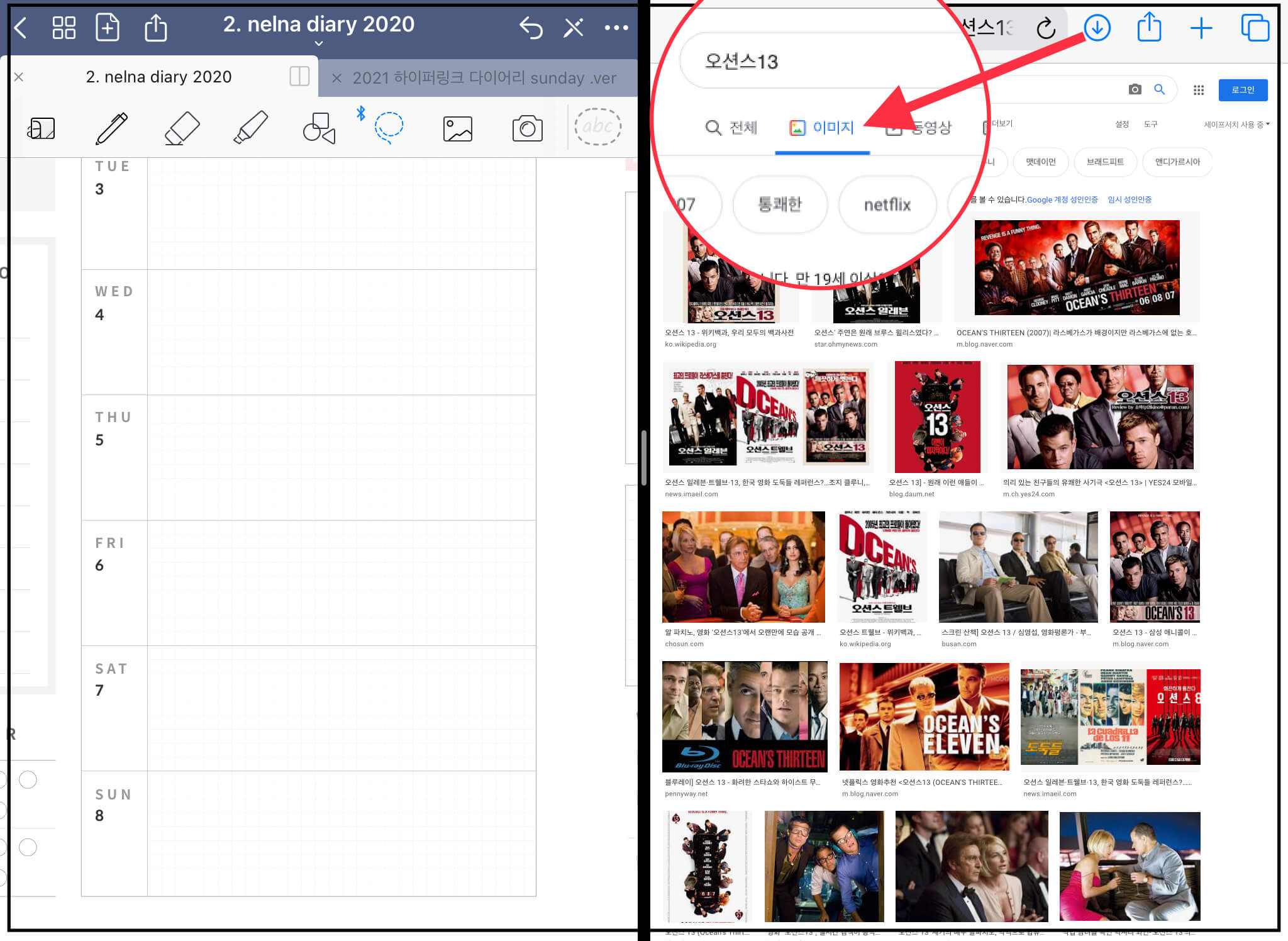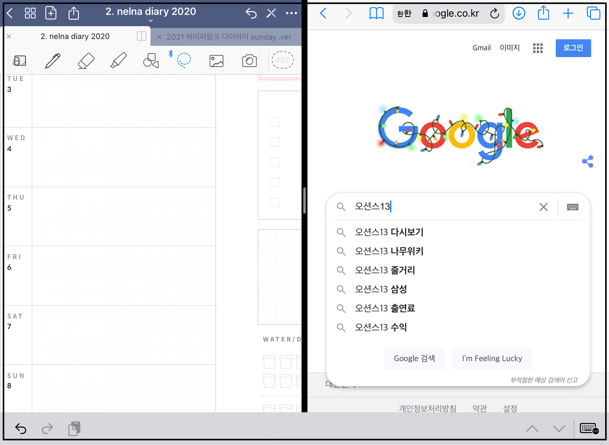▼ 아래와 같이 화면 분할이 되었습니다. 여기서 이미지 검색 후, 이미지를 굿노트에 바로 가져다 놓을 수 있습니다.