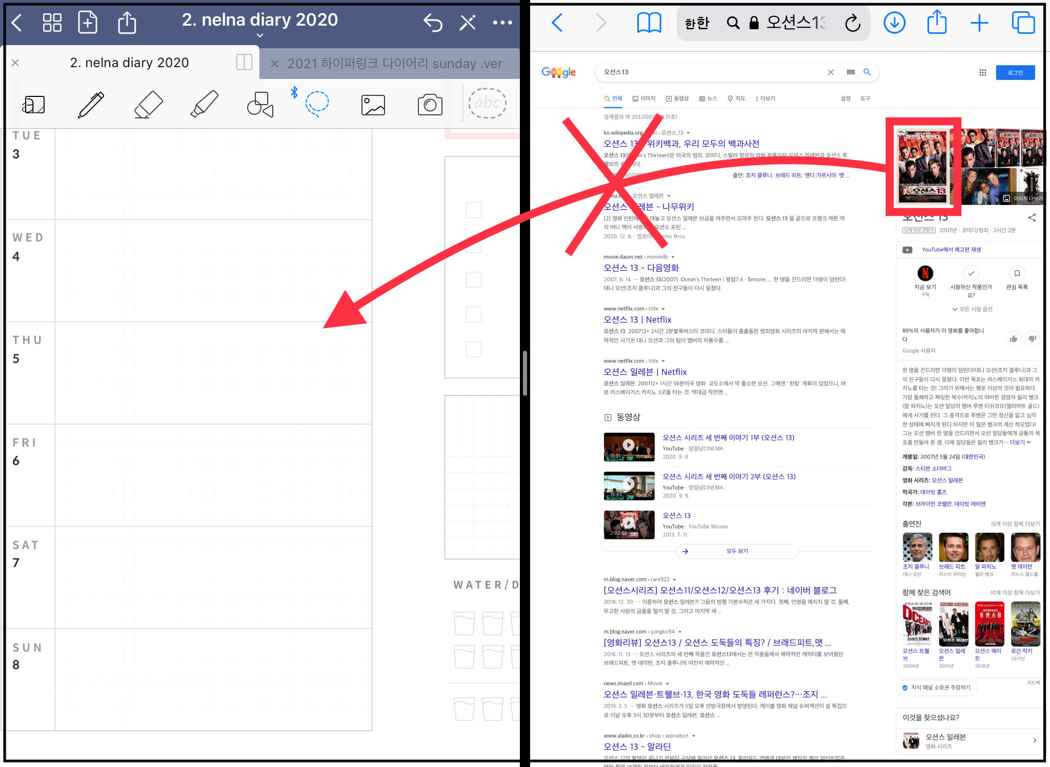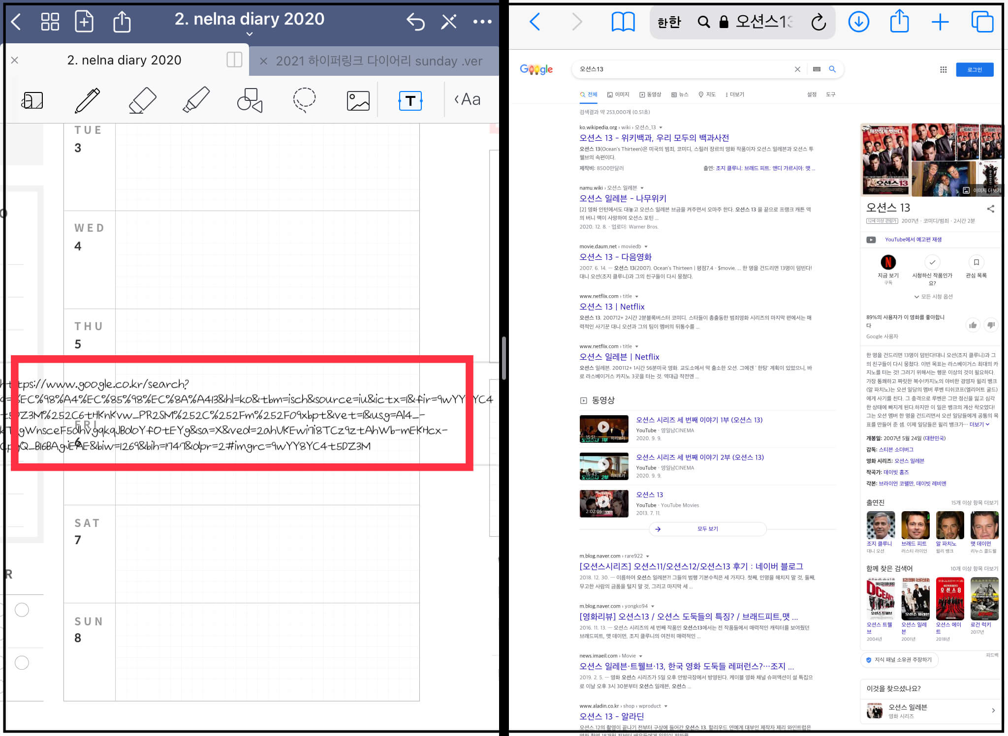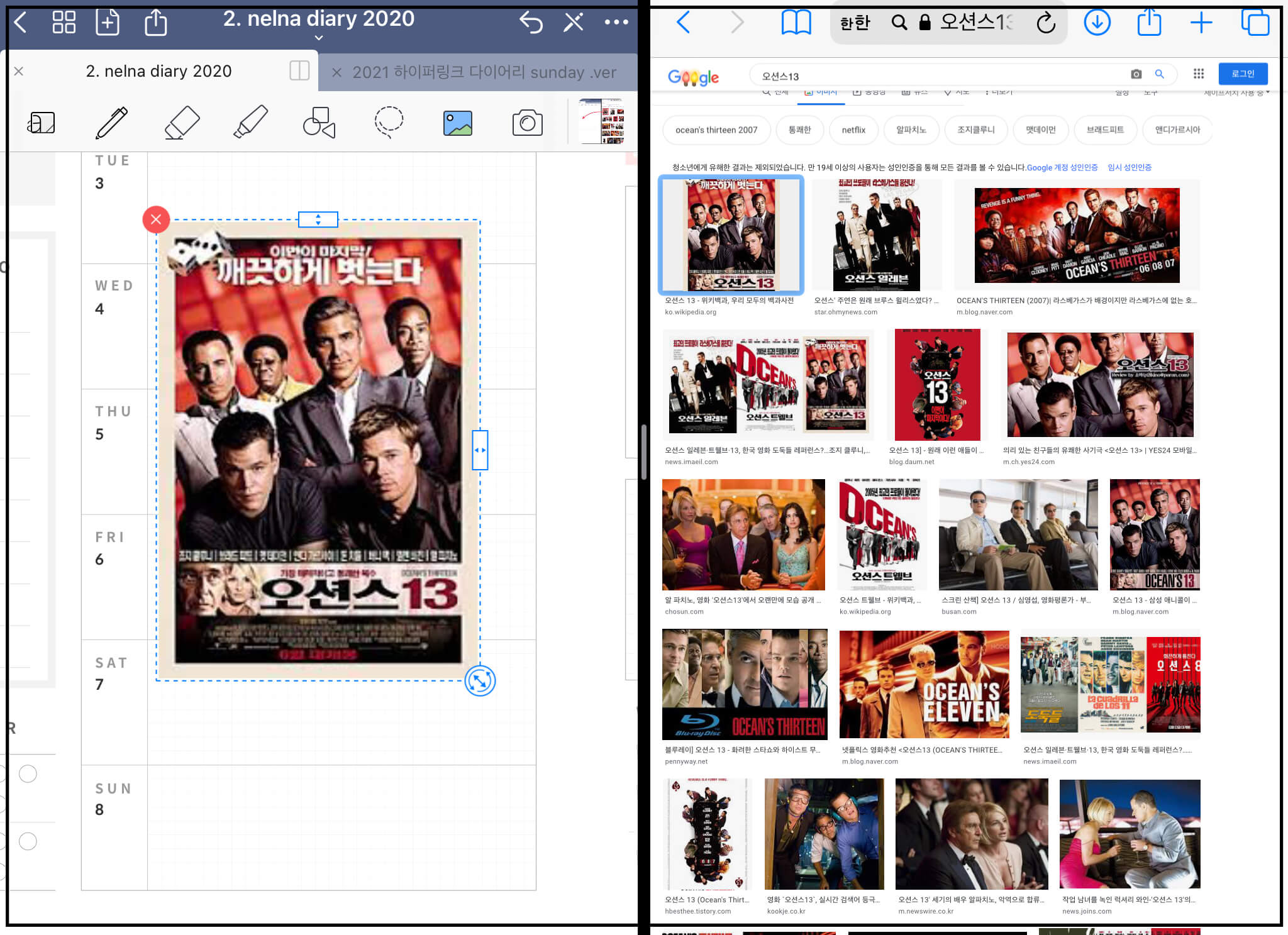 ▼ 아래와 같이 화면 분할이 되었습니다. 여기서 이미지 검색 후, 이미지를 굿노트에 바로 가져다 놓을 수 있습니다.