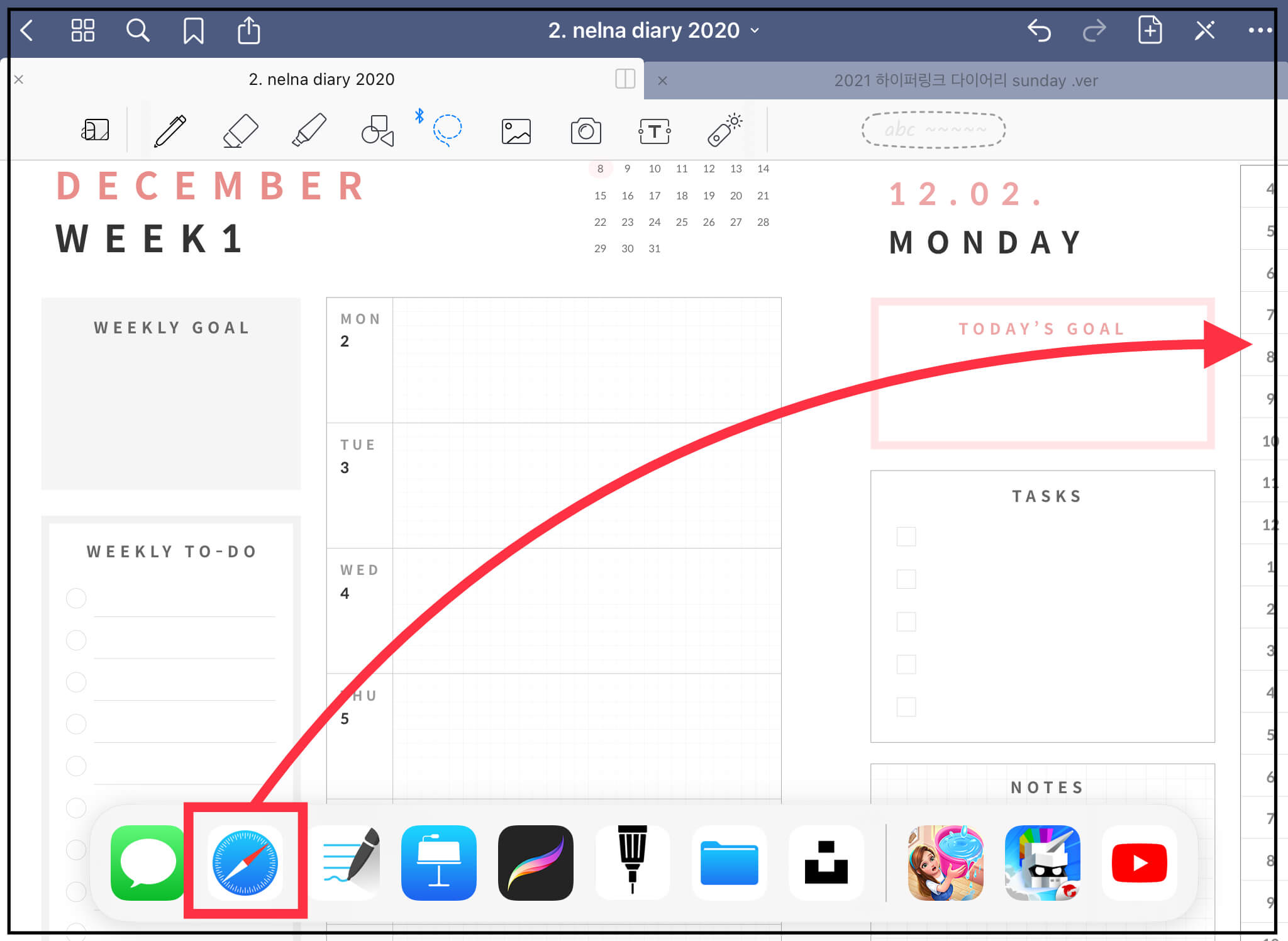 ▼ 먼저 굿노트에서 이미지를 가지고 오기 위해서는 굿노트와 Safari창을 화면 분할하여(스플릿 뷰) 한꺼번에 열어 줍니다. (굿노트에서 화면 분할하는 방법) 분할화면을 해주기 위해서, 아이패드 화면을 아래에서 위로 쓸어 올립니다.