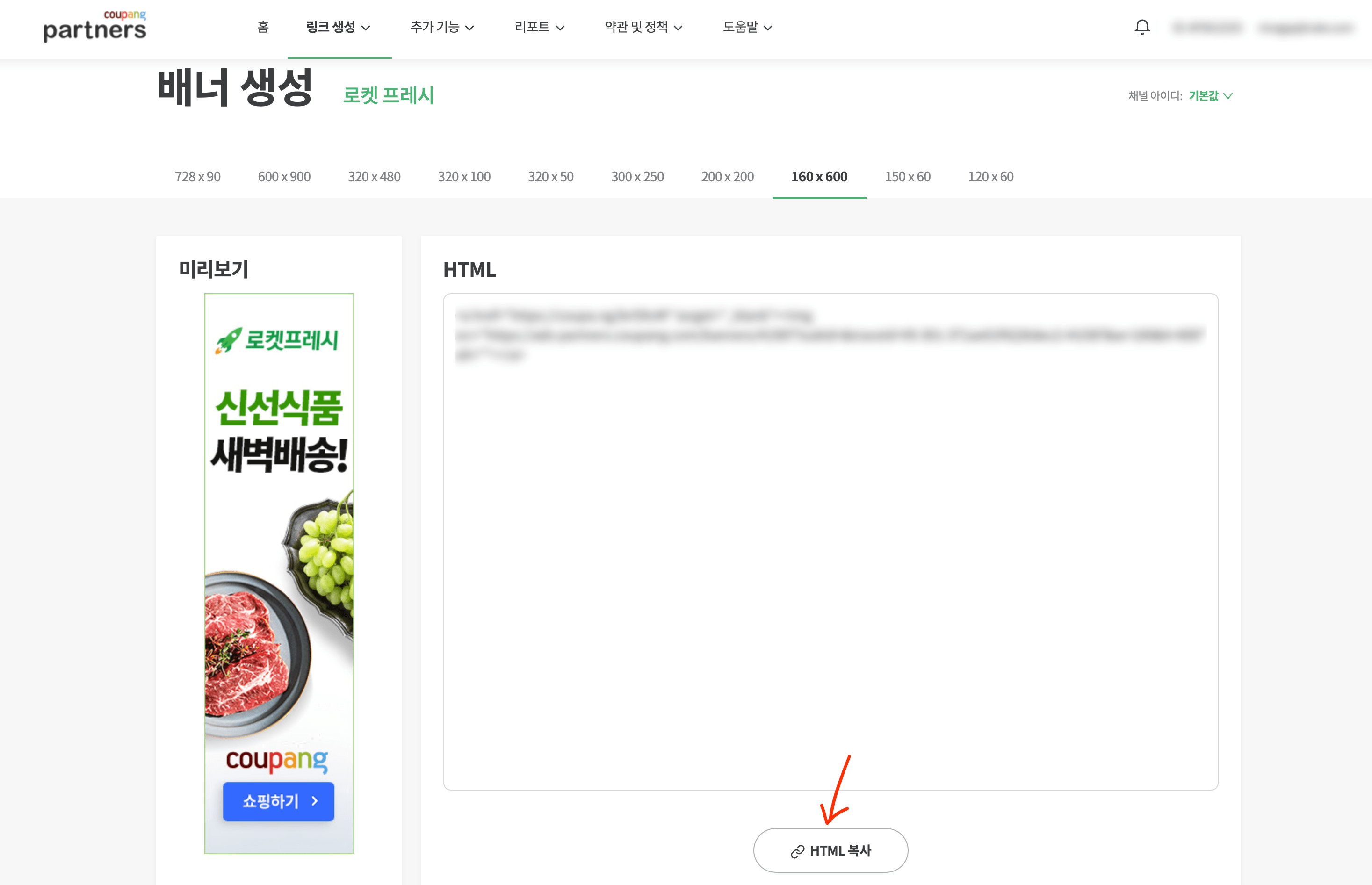 카테고리 배너 중에서도 제가 종종 이용하고 있는 [로켓 프레시]를 선택했습니다. 그러면 아래와 같이 배너 크기를 선택할 수 있습니다. 저는 사이드바에 길게 배너를 만들고 싶기 때문에, 160x600 사이즈로 선택합니다. 그렇게 되면 자동으로 링크가 만들어지고, 아래에 있는 [HTML 복사] 버튼을 눌러주면 복사가 완료됩니다.