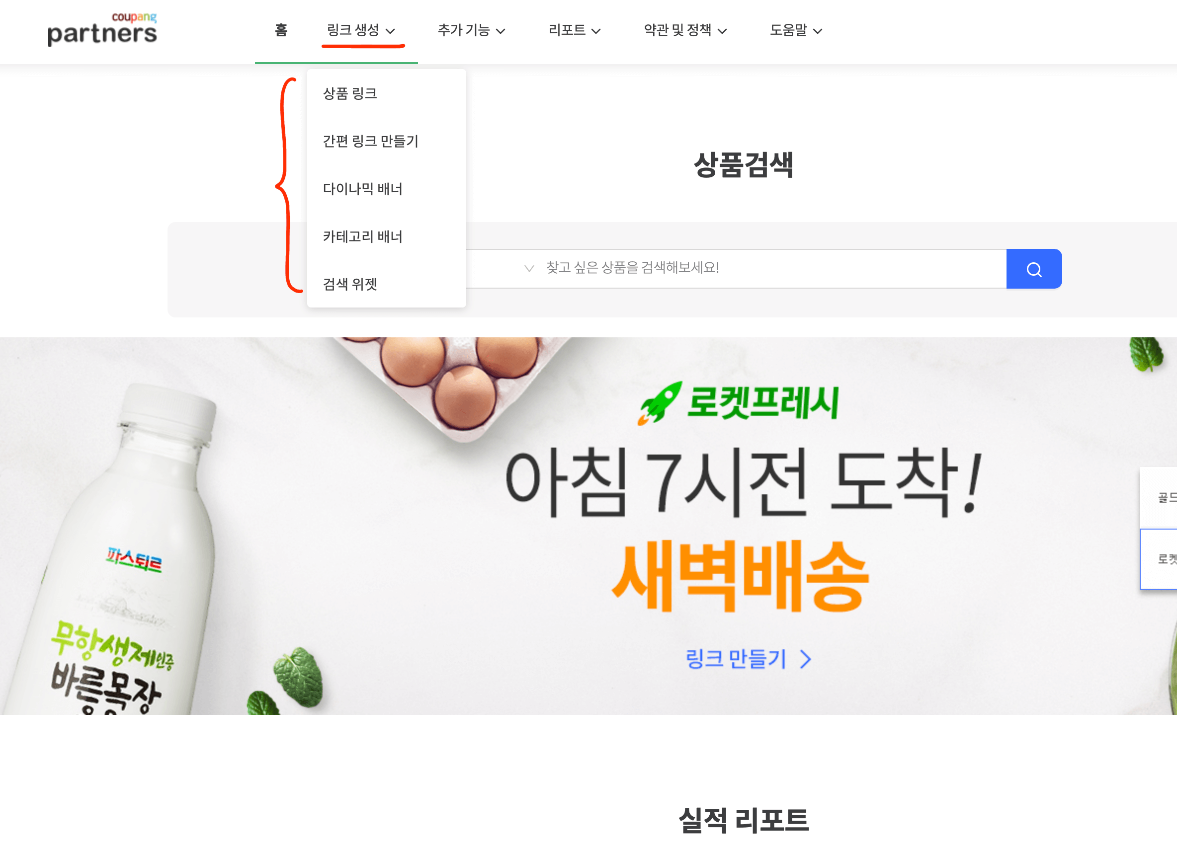 여기서 링크 생성을 눌러주면 5가지의 광고를 선택할 수 있습니다. 특정 상품을 검색해서 링크를 넣어주려면 '상품링크' 혹은 '간편 링크 만들기'를 이용하면 되고, 특정 종류의 상품을 다양하게 보여주고 싶으면 '다이나믹 배너' 를 이용하면 됩니다. 쿠팡 자체의 링크를 넣고 싶을 경우에는 '카테고리 배너'를 이용합니다. '쿠팡 검색 위젯'은 바로 쿠팡 제품 검색창이 나오는 링크입니다.