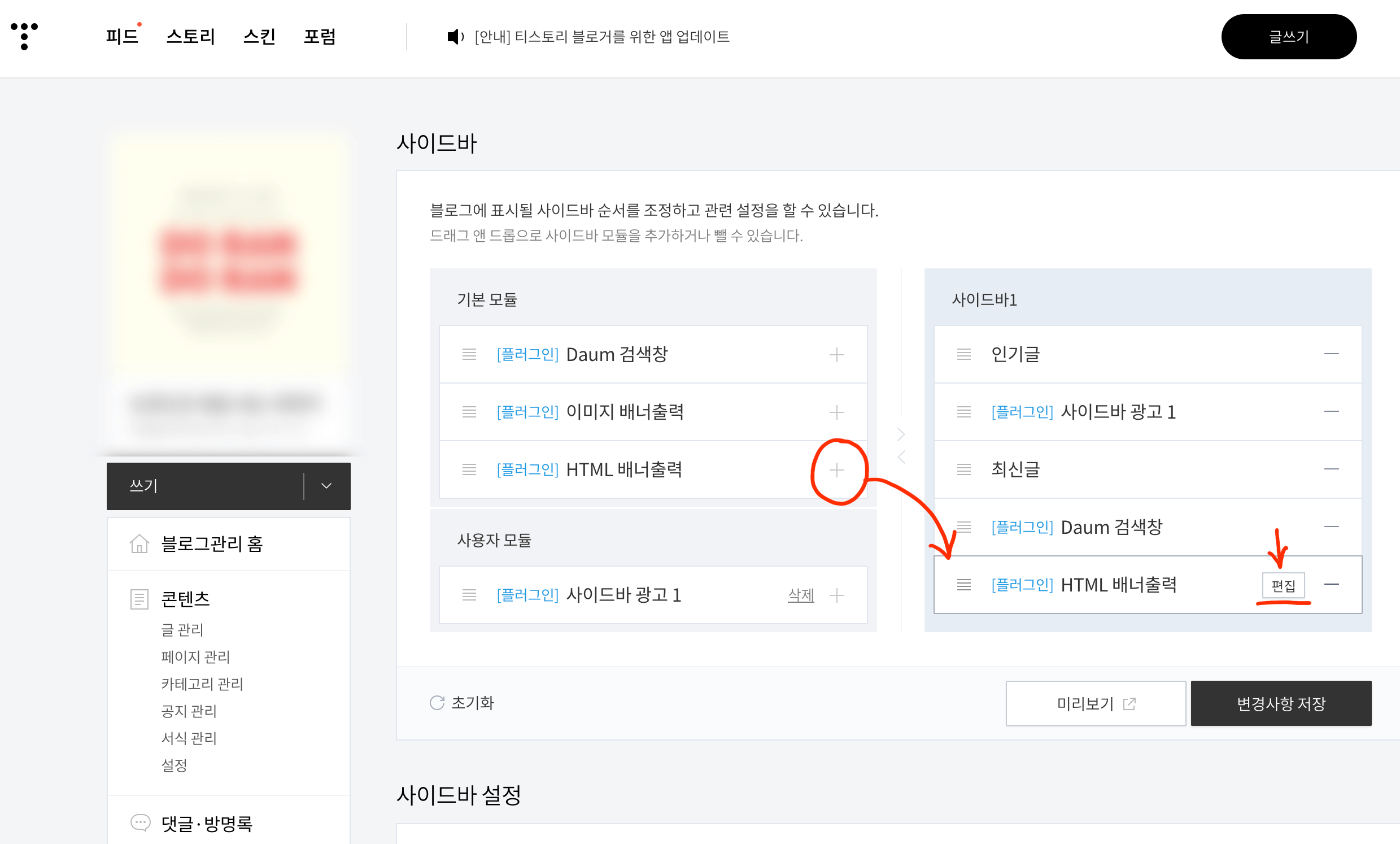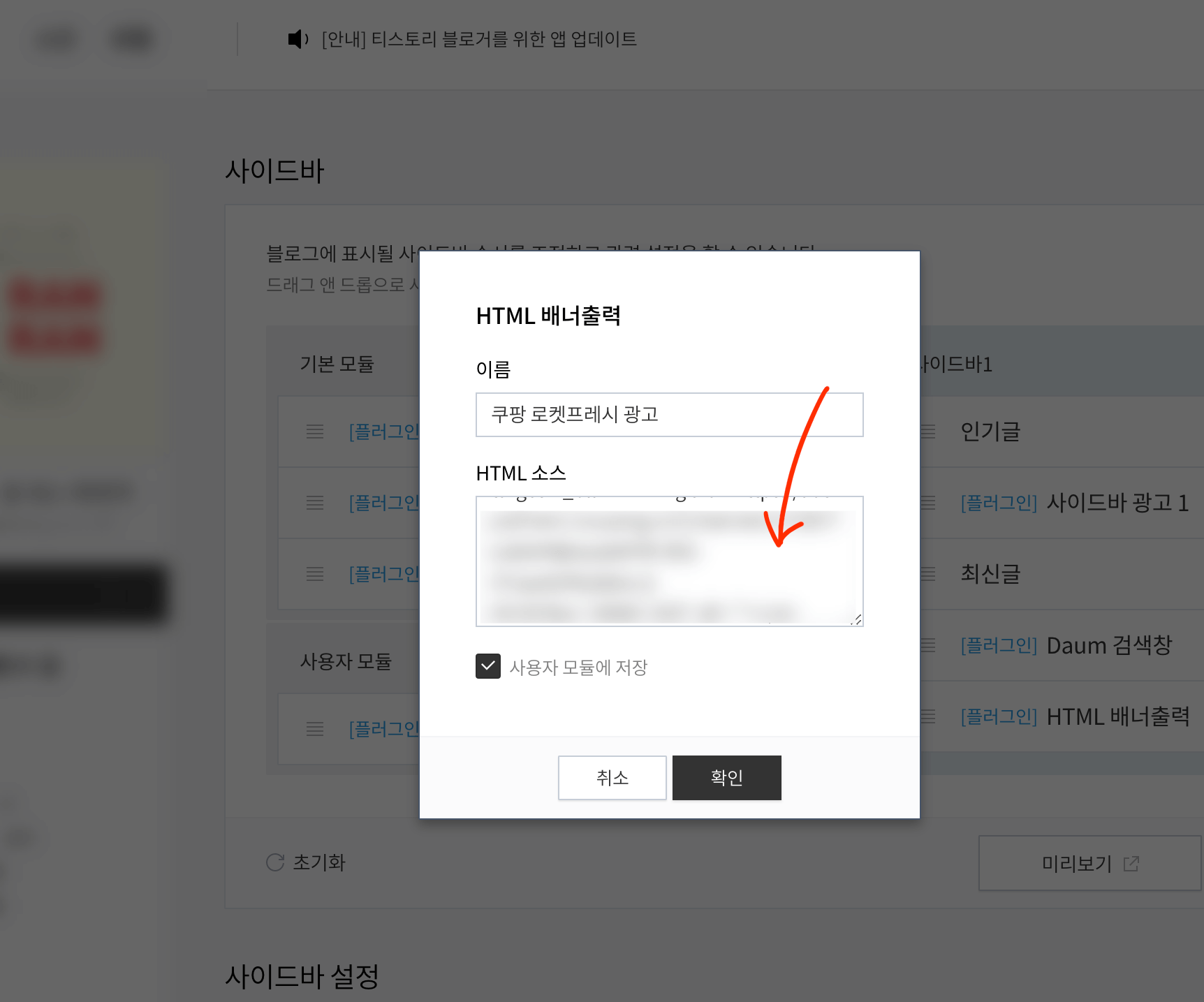 그리고 기본 모듈 안에 있는 [HTML 배너출력] 우측의 + 버튼을 눌러주면 사이드바에 광고를 넣을 자리가 생기게 됩니다. 여기 우측에 커서를 가져다 놓으면 [편집] 버튼이 나오게 됩니다. 편집을 누르면 아래와 같이 복사한 링크를 넣을 팝업창이 나옵니다.