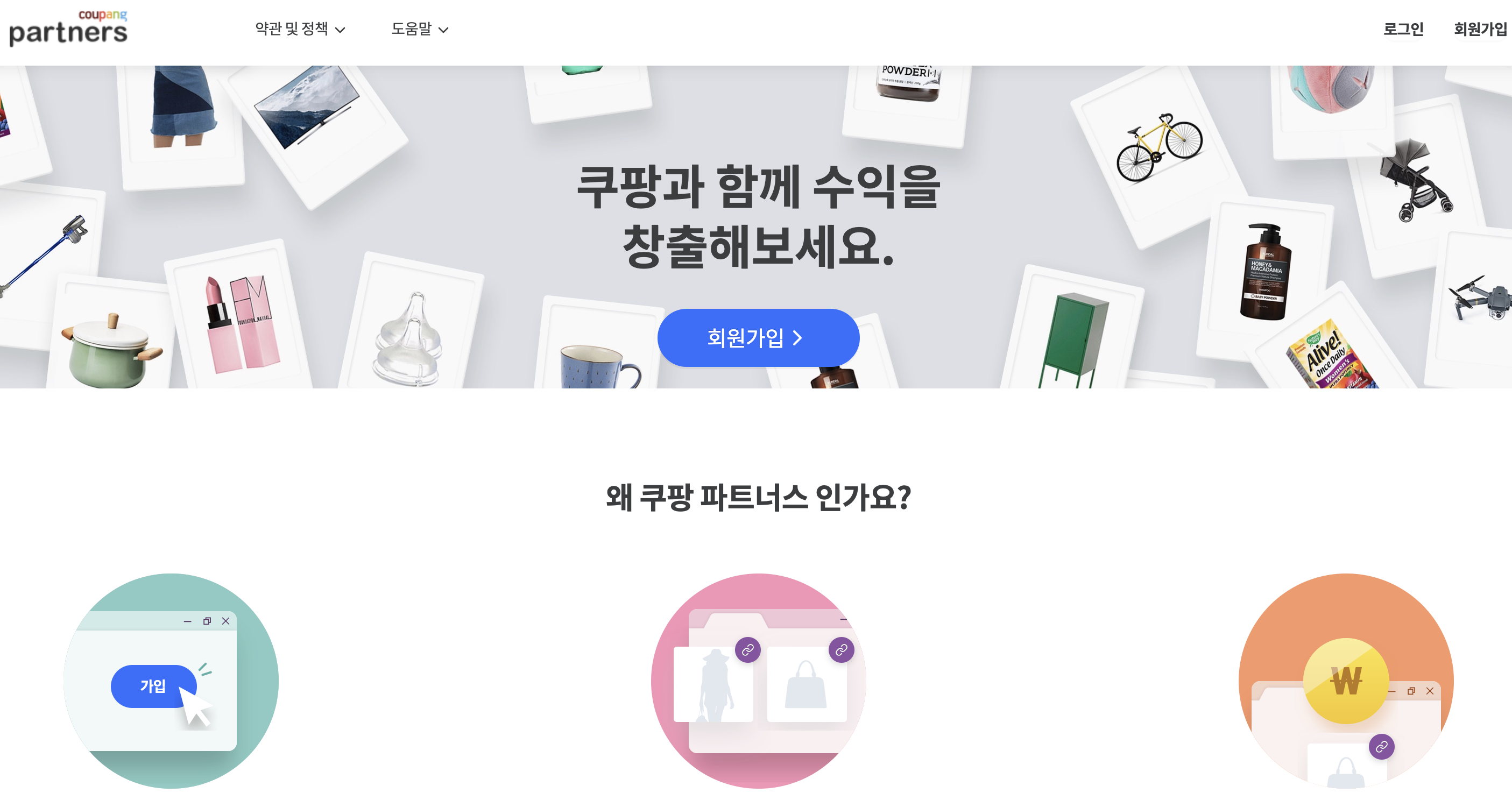 쿠팡 파트너스 홈페이지에 들어가면 아래와 같은 화면이 나옵니다. 여러분이 사용하고 계신 기존 쿠팡 아이디로 가입 가능합니다. 쿠팡 아이디가 없는 분들은 새롭게 회원가입을 해주면 됩니다.
