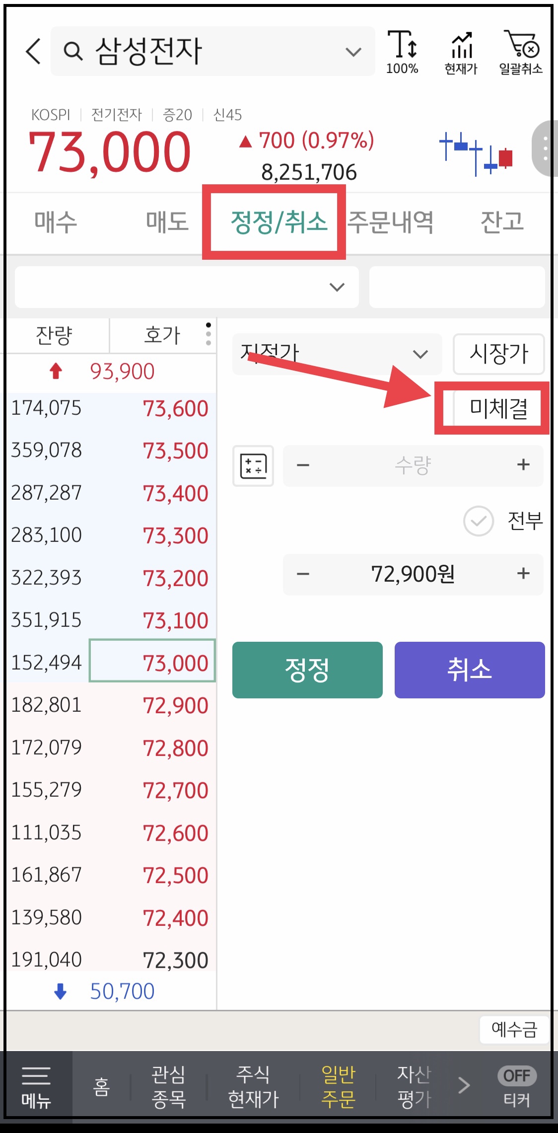 ▼ 상단에 있는 [정정/취소]메뉴를 선택한 뒤, 중간에 오른쪽에 있는 [미체결]을 선택합니다.