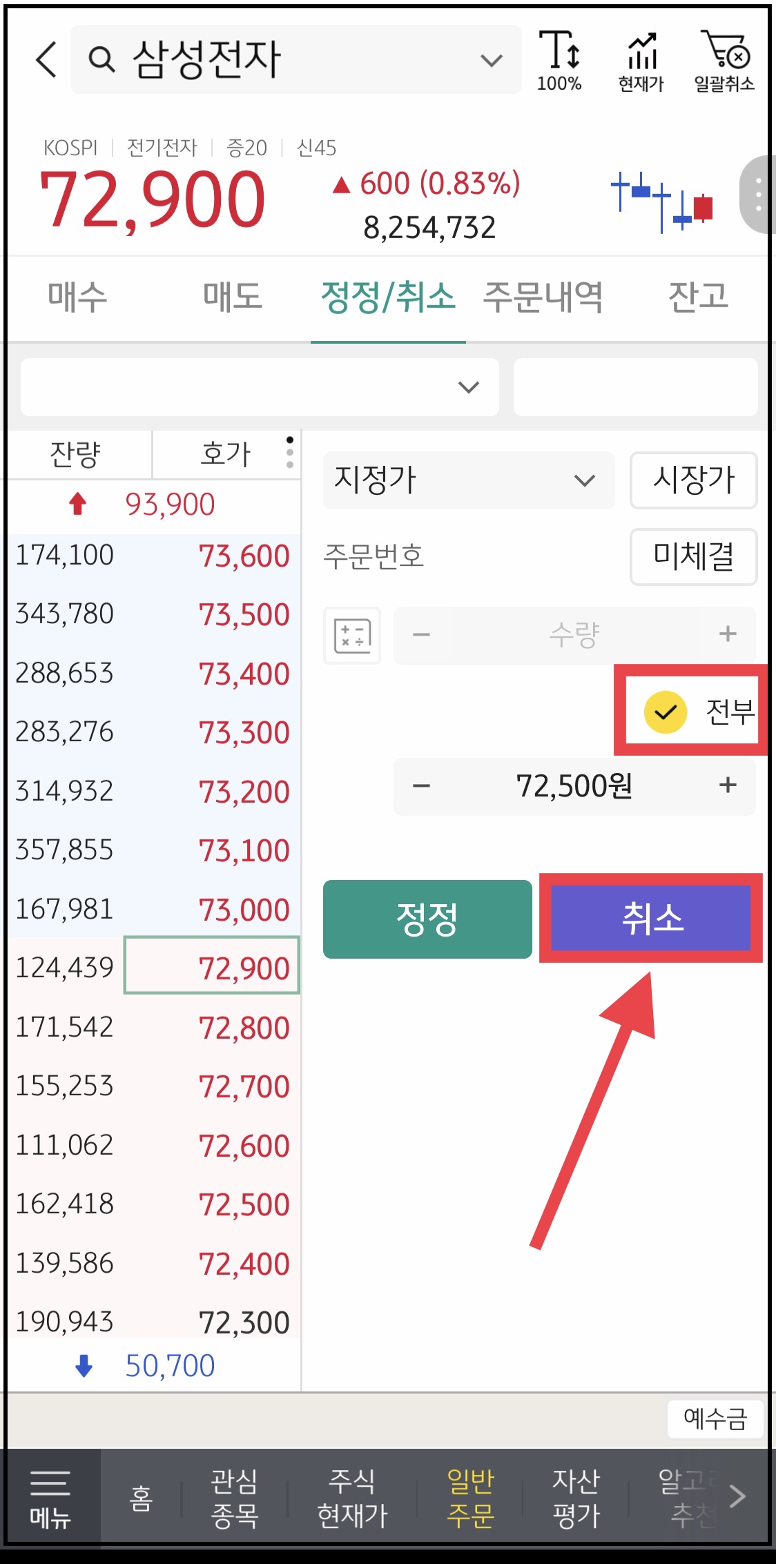 ▼ 아래와 같이 주식 주문을 정정하거나 취소할 수 있습니다. 주문 수량 전체를 취소하기 위해서 중간 [전부]에 체크를 해주고 [취소] 버튼을 누릅니다.