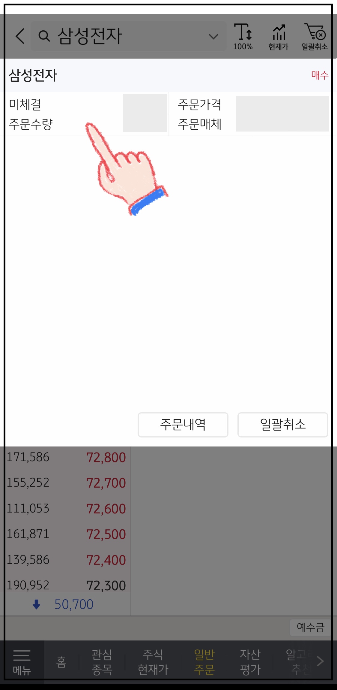 ▼ 아래와 같이 미체결된 주식 주문 내역이 나옵니다. 이 미체결 주식 내용을 선택합니다.