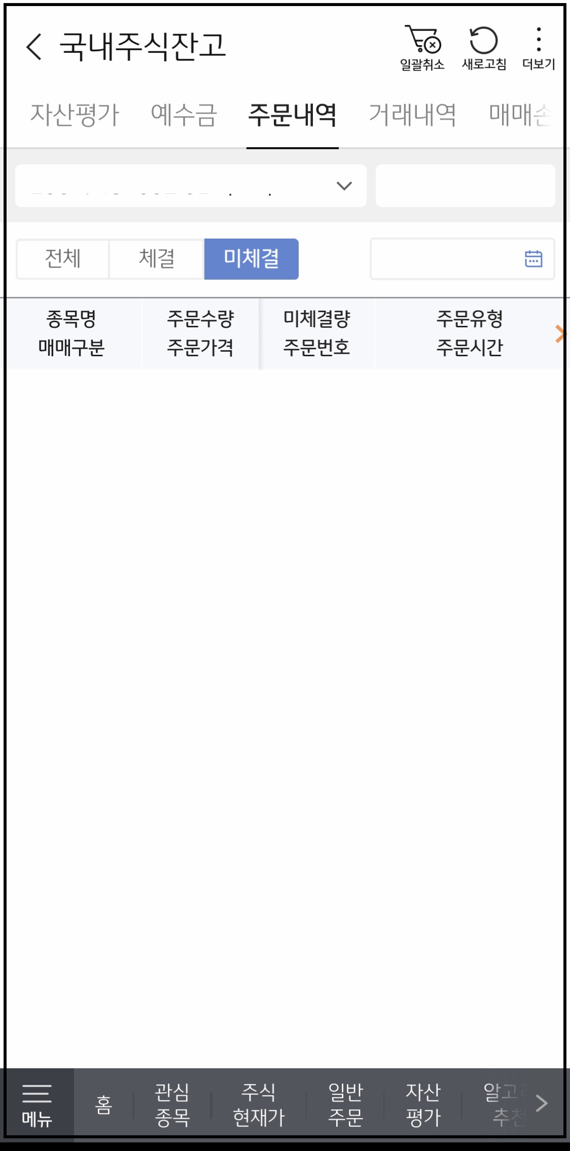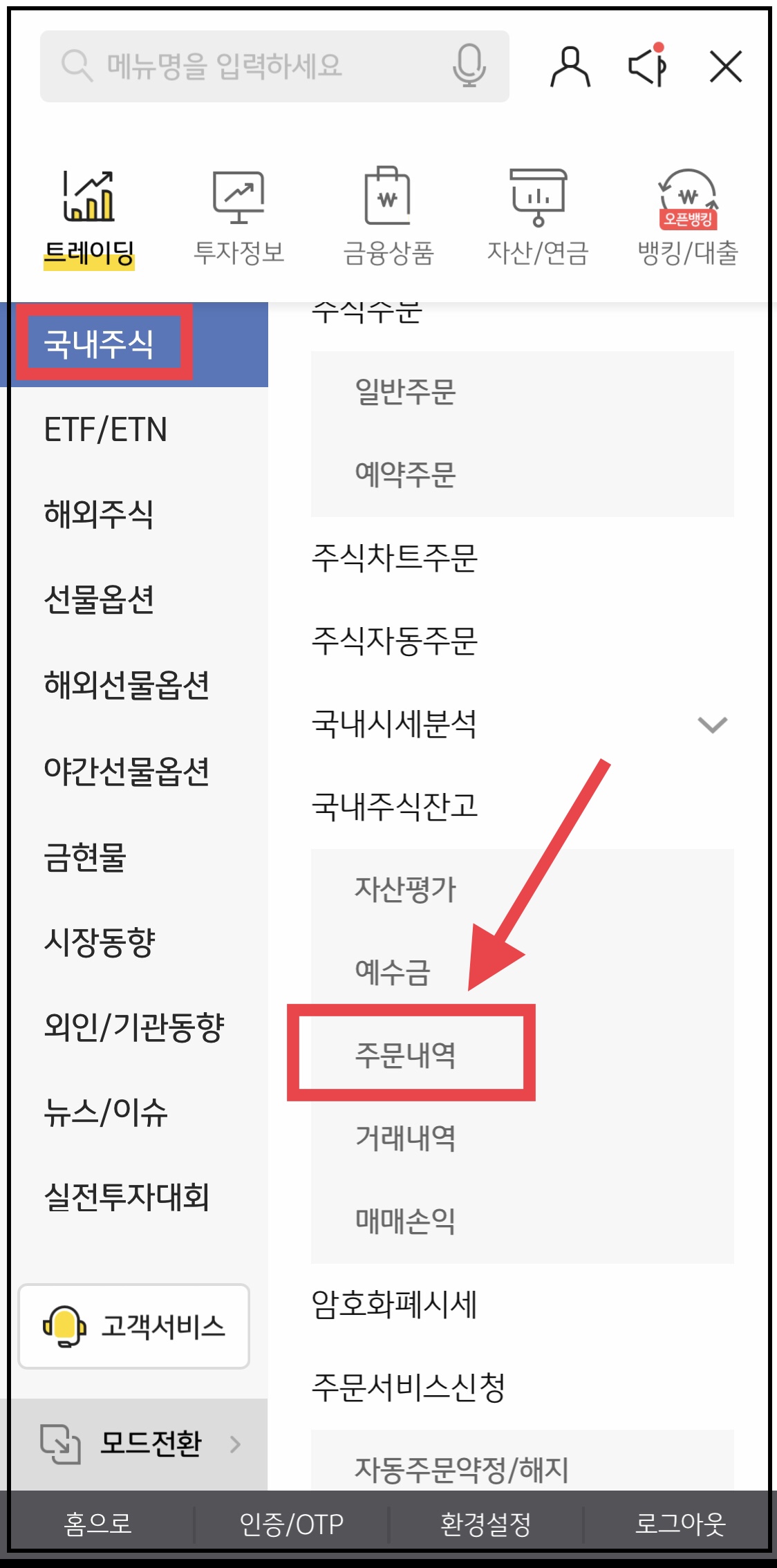 ▼ 다른 경로로 미체결된 주식 주문을 취소할 수 있습니다. 아래와 같이 왼쪽 메뉴창에서 [국내주식] - [국내 주식 잔고] - [주문내역]에 들어가면 아까와 같은 화면이 나오는데 여기서 종목을 선택하고 미체결 주식 주문을 취소할 수 있습니다.