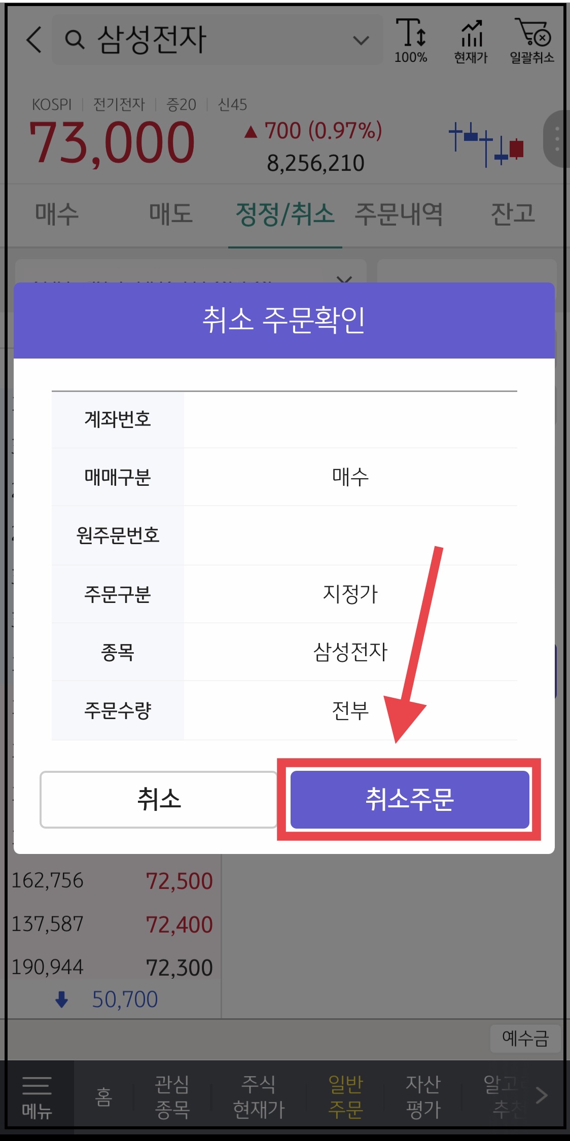 ▼ 아래와 같이 취소 주문 확인 팝업창이 나옵니다. 주문이 맞는지 확인을 하고, [취소주문]을 누릅니다.