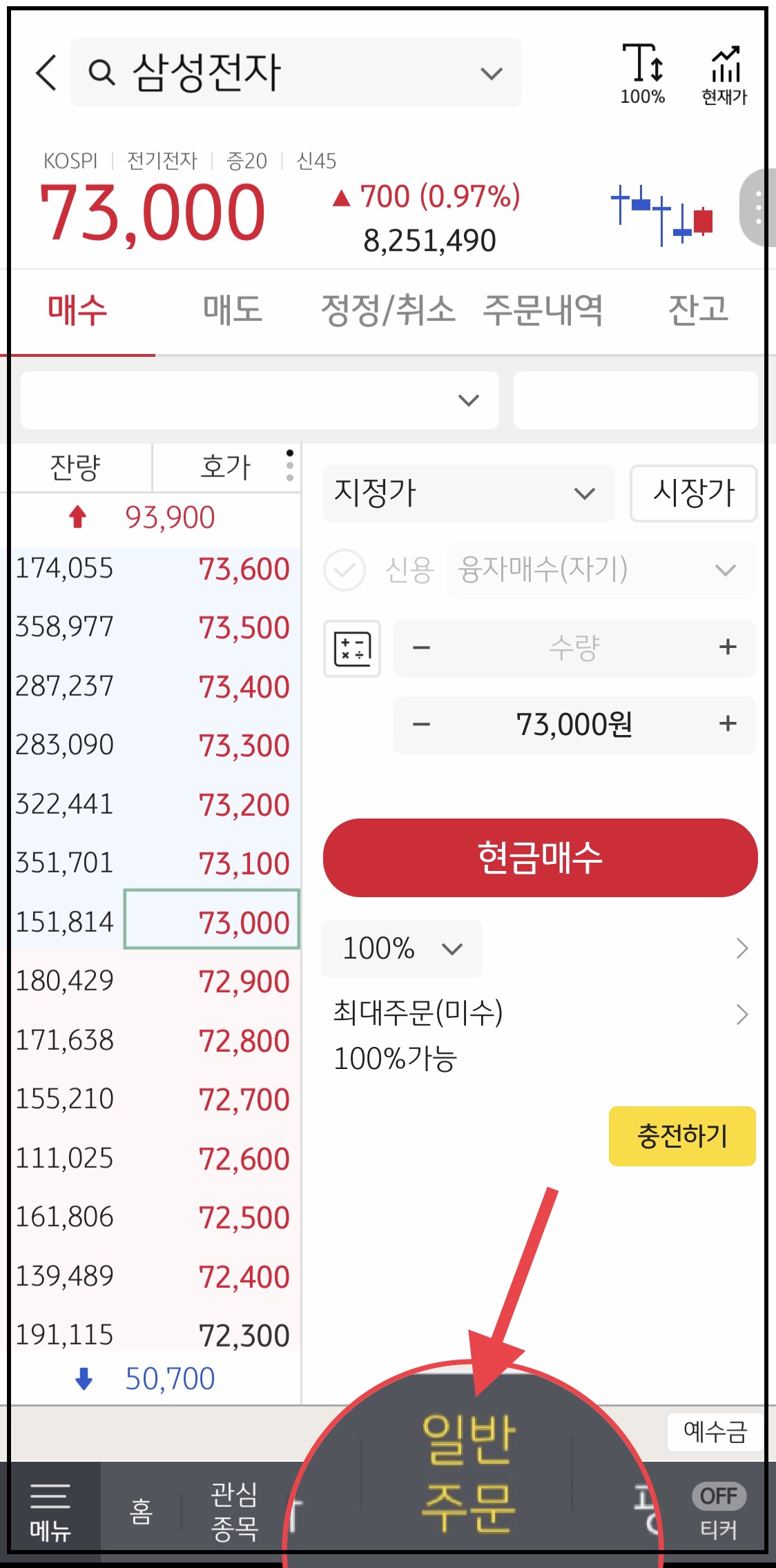 ▼ 먼저 KB증권 모바일 어플 M-able에 접속한 뒤, 로그인을 합니다. 하단에 있는 [일반주문] 메뉴를 누릅니다.