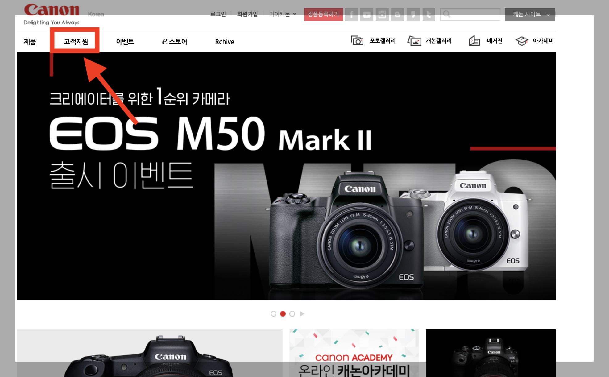▼ 캐논 홈페이지에 들어간 뒤 왼쪽 상단에 있는 [고객지원]으로 들어갑니다.
