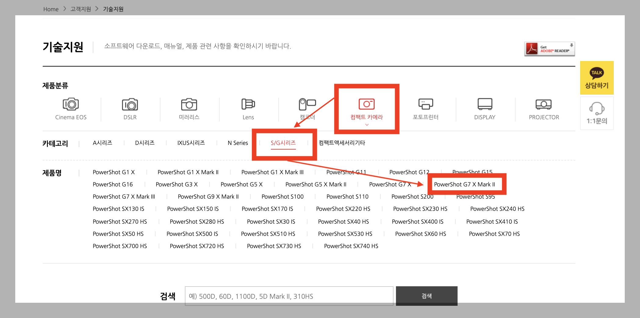 ▼ [컴팩트 카메라] - [S/G 시리즈] - [PowerShot G7X Mark 2] 순서대로 선택합니다.