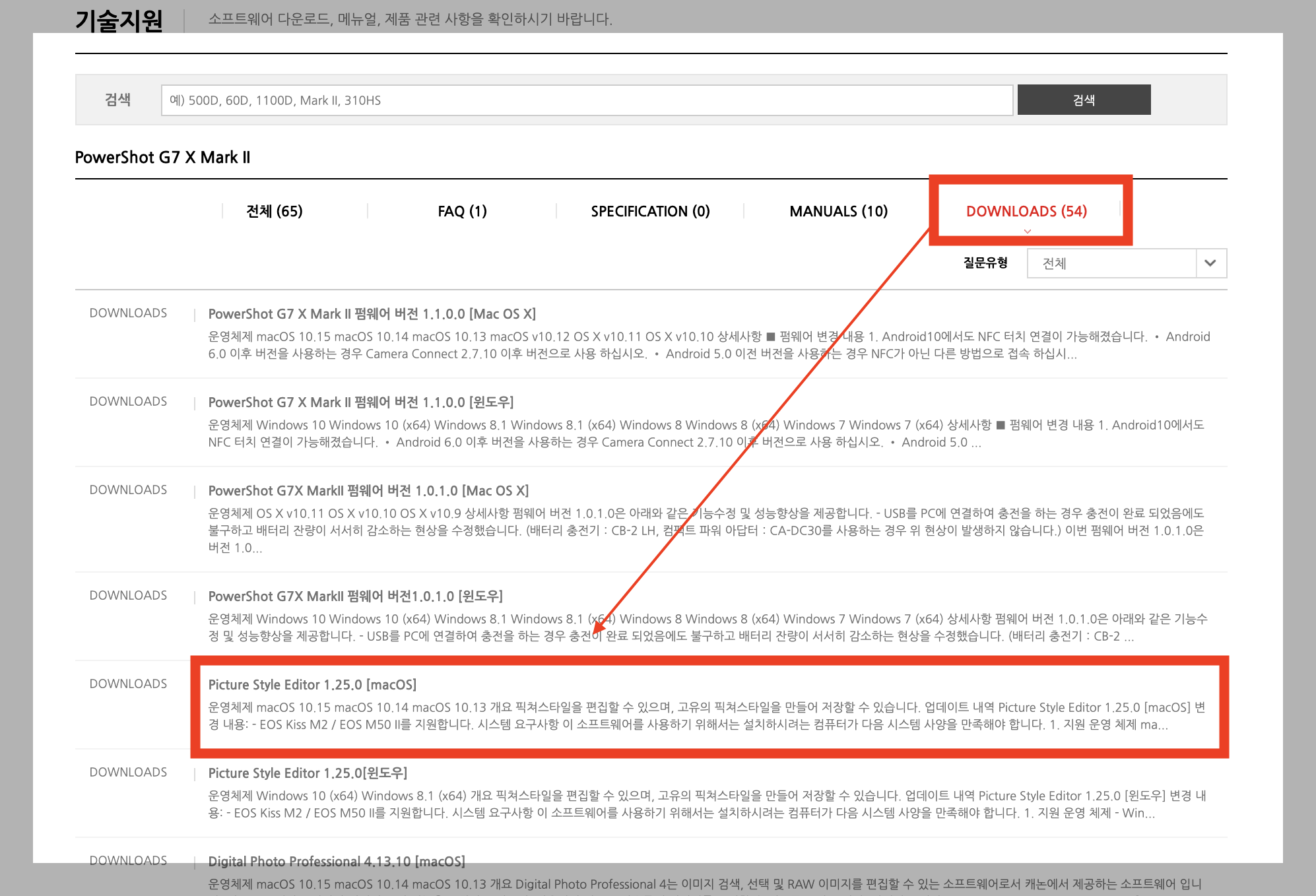 ▼ 오른쪽 다운로드를 누른 뒤, 현재(2020.12) 기준으로 다섯번째에 있는 Picture Style Editor 1.25.0 [macOS]를 선택합니다. (다운로드 페이지 바로가기)