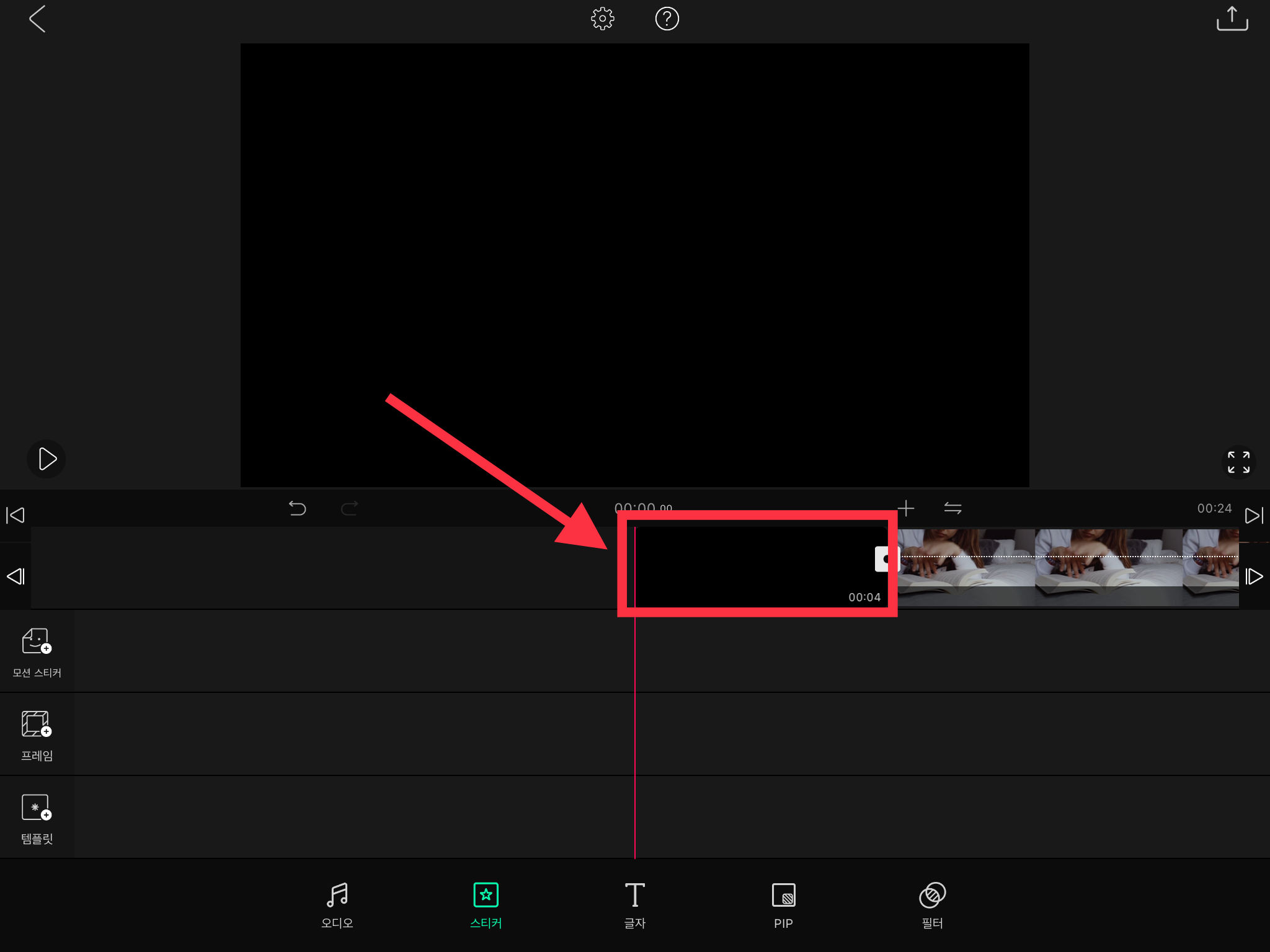 ▼ 아래와 같이 검은색 바탕의 빈 화면이 추가되어 나옵니다. 여기서 검은색 화면을 타임라인에서 선택합니다.