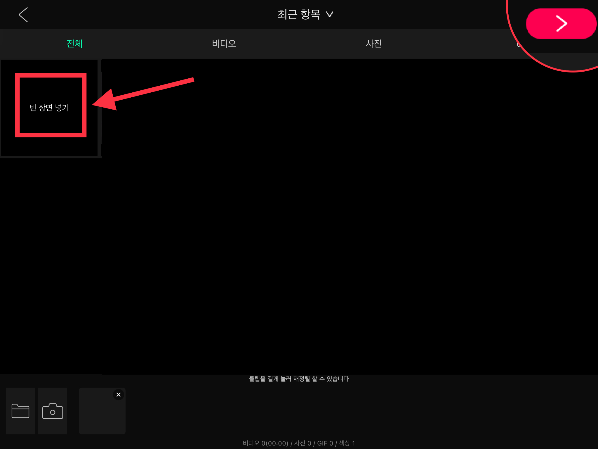 ▼ 그리고 가장 앞에 있는 [빈 장면 넣기]를 선택해주세요. 그리고 오른쪽 상단의 다음 버튼을 누릅니다.