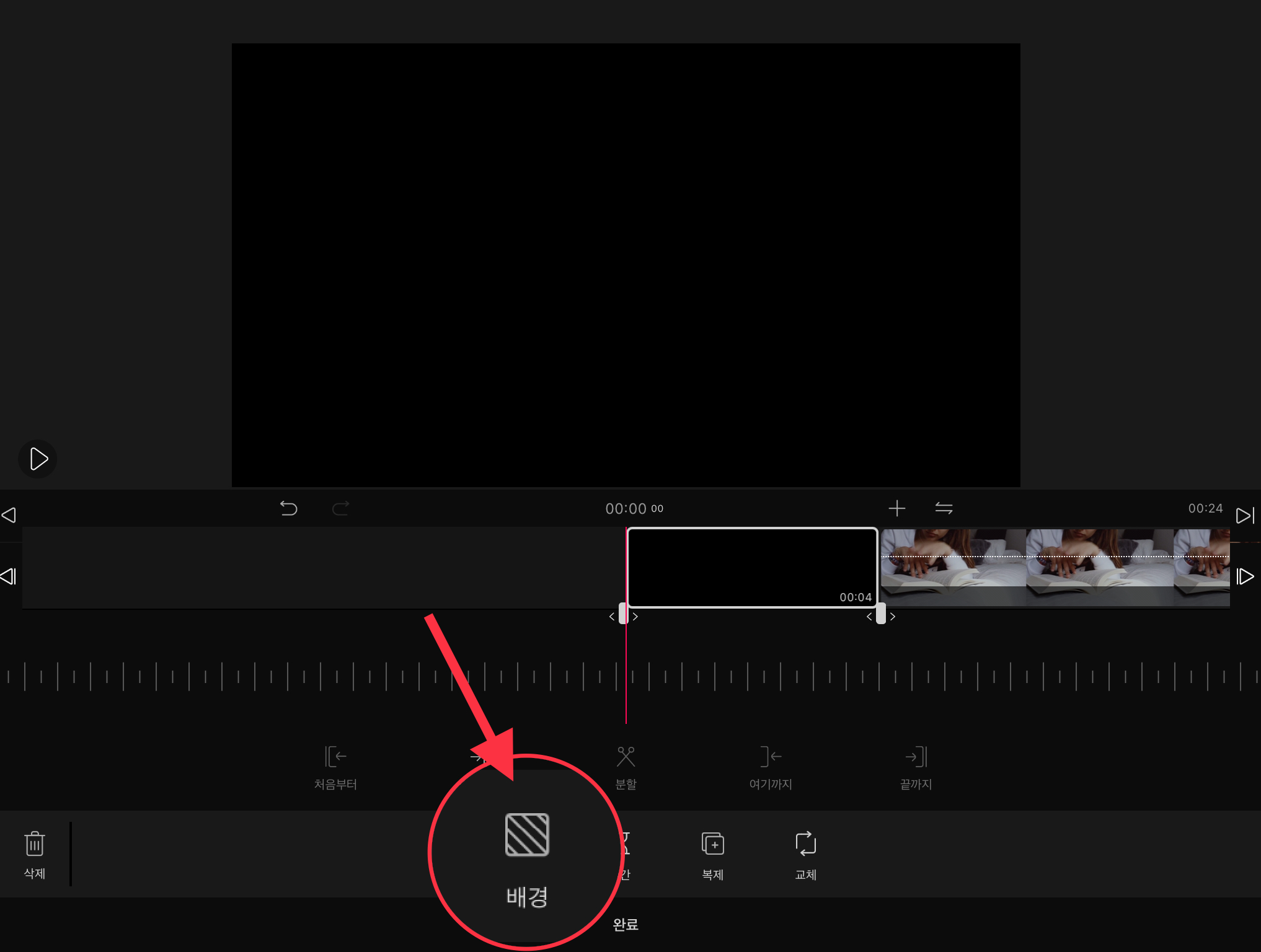 ▼ 그러면 하단에 메뉴가 나옵니다. 여기서 가장 왼쪽에 있는 [배경] 메뉴를 선택합니다.