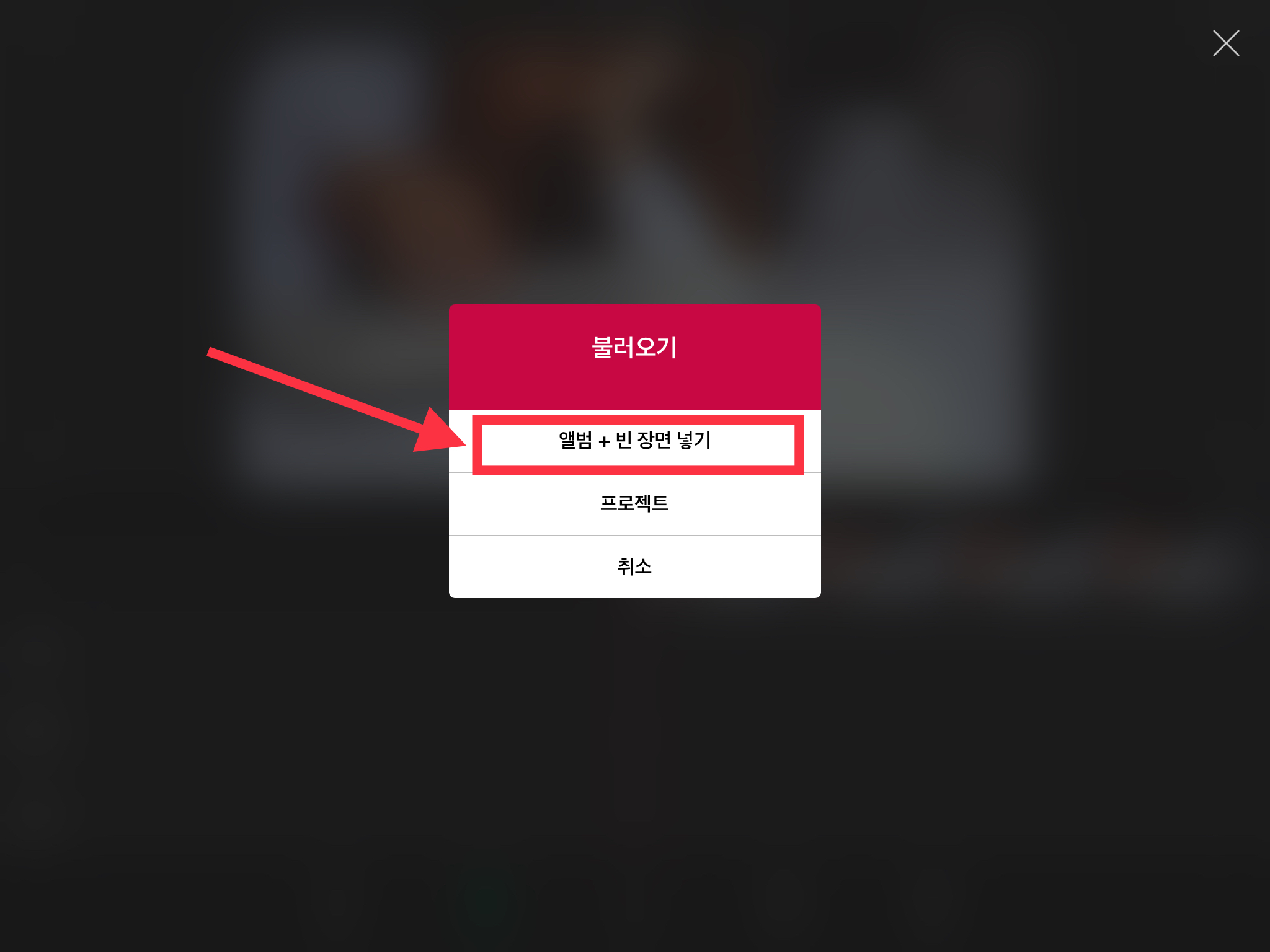 ▼ 아래와 같은 팝업창이 나오면 [앨범 + 빈 장면 넣기]를 누릅니다.