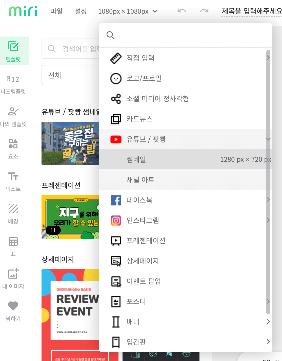 미리 캔버스를 시작하면 아래와 같은 화면이 나오는데, 가장 먼저 캔버스 크기를 유튜브 썸네일로 설정해주어야 합니다. 아래와 같이 1080px1080px 라고 적힌 부분을 클릭하면, 캔버스 크기를 변경할 수 있습니다. 사용자가 직접 입력해주어도 되지만, 유튜브 썸네일을 누르면 자동으로 썸네일 템플릿이 나오기때문에 썸네일로 변경해주는 것을 추천합니다.
