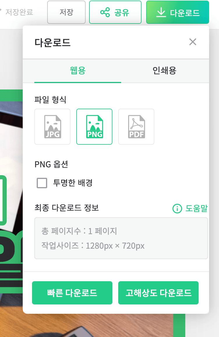 우측 상단에 보면 다운로드 버튼이 있습니다. 다운로드 할 때에는, [웹용] - [PNG] - [빠른다운로드]를 이용합니다.