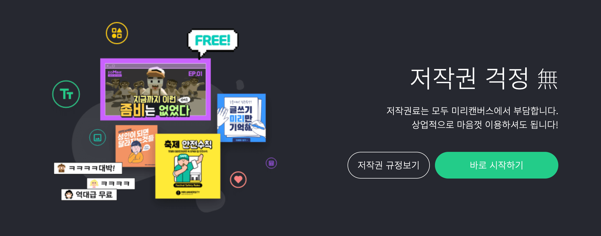 미리캔버스의 가장 큰 장점은 상업적으로 이용 가능하다는 점입니다. 아래와 같이 저작권료는 모두 미리캔버스에서 부담을 한다고 합니다. 무료로 사용시 워터마크가 있는 사이트도 있는데, 워터마크가 아예 없는 무료 사이트 입니다.