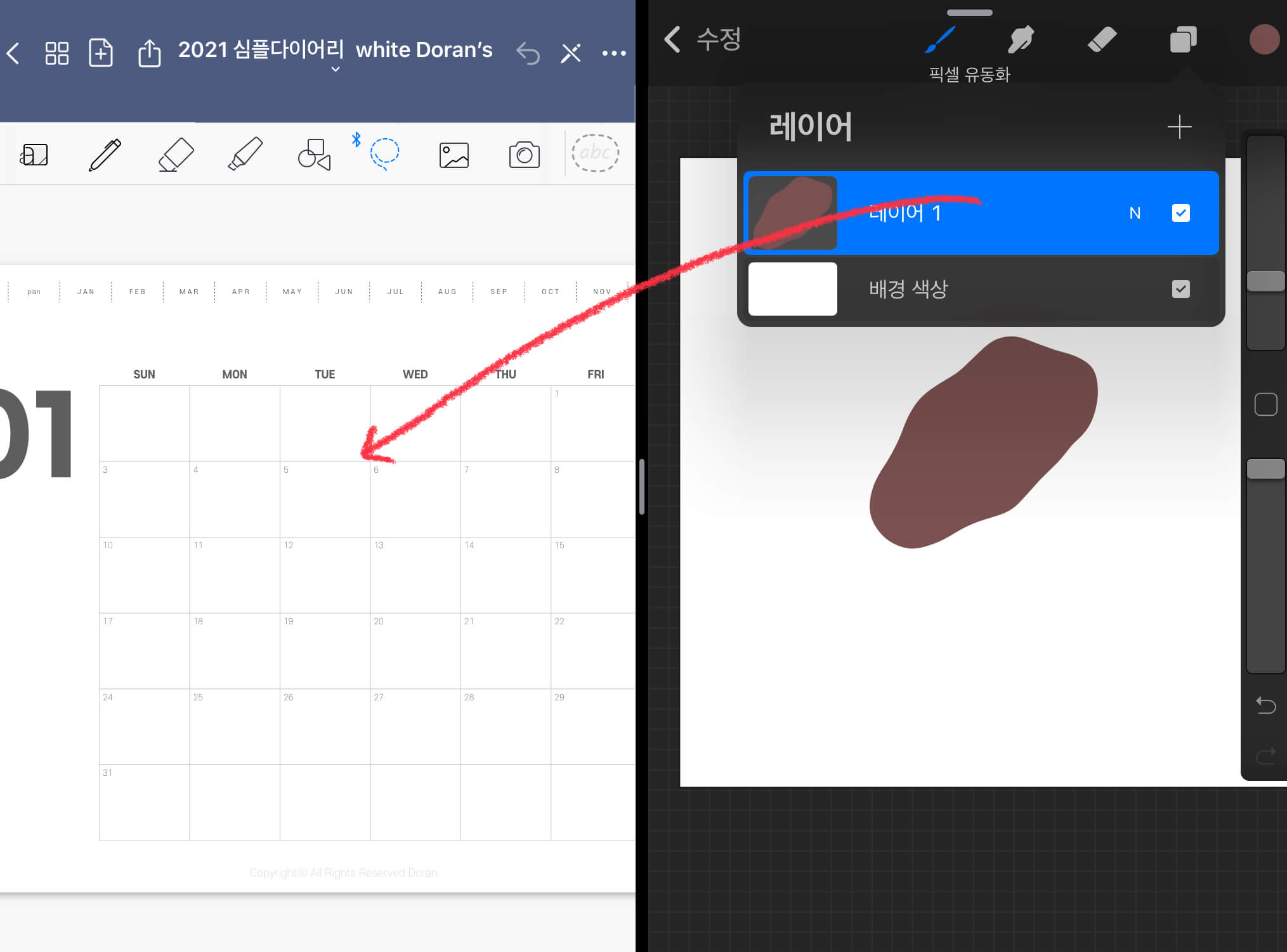 ▼ 프로크리에이트에서 스플릿뷰를 이용해서 굿노트를 동시에 열어줍니다. 그리고 레이어에서 굿노트로 쭉 끌어옵니다.