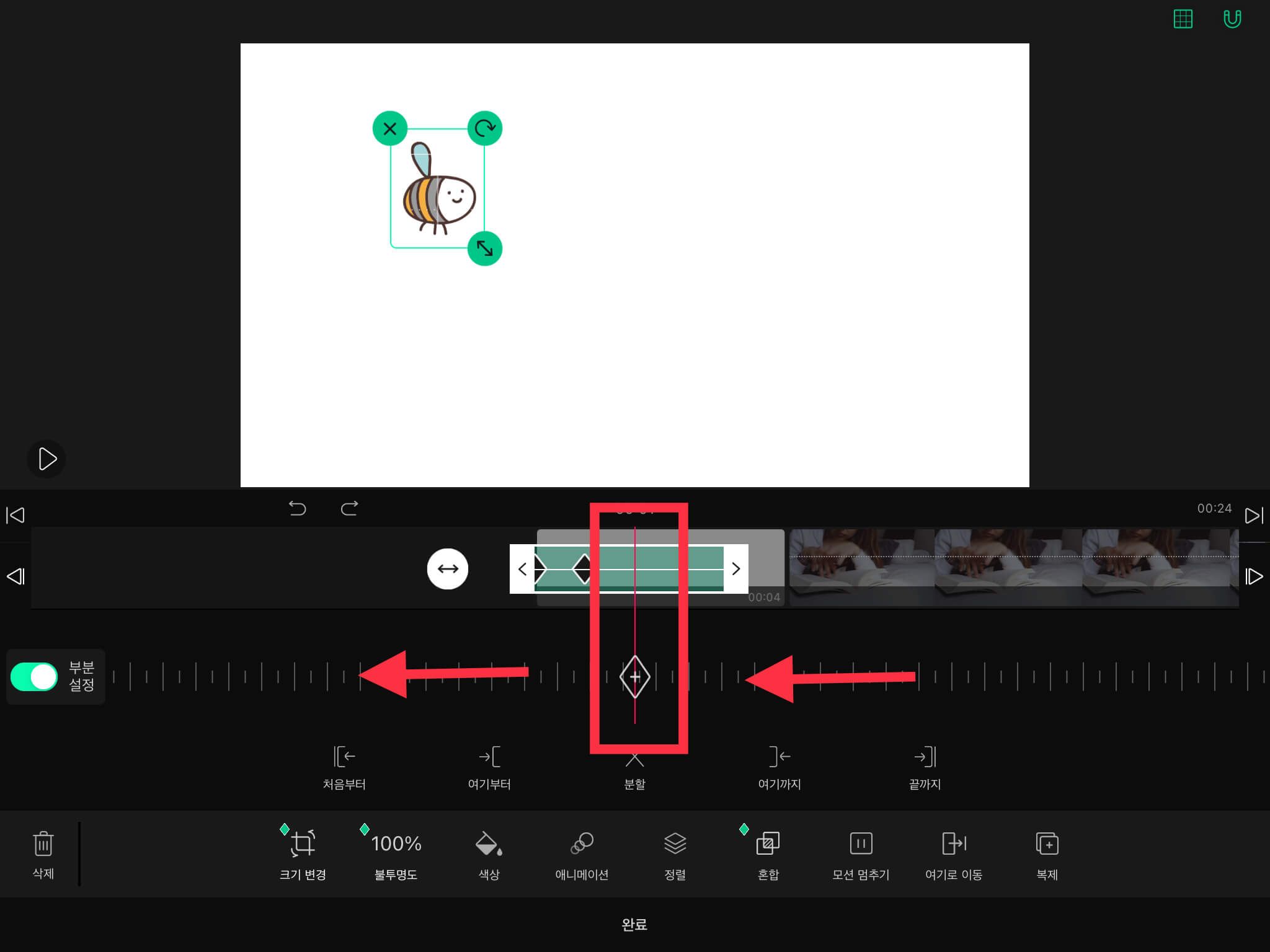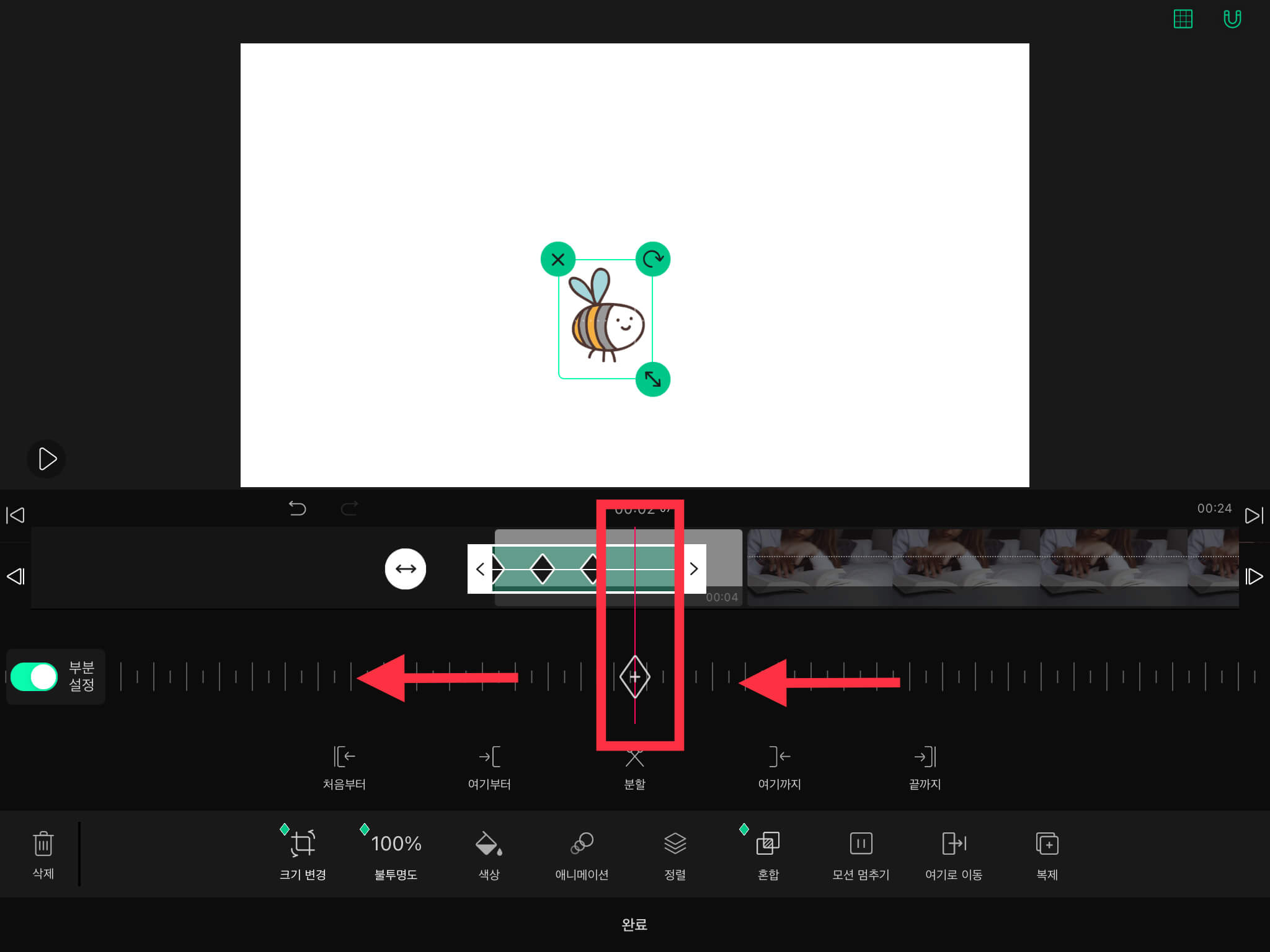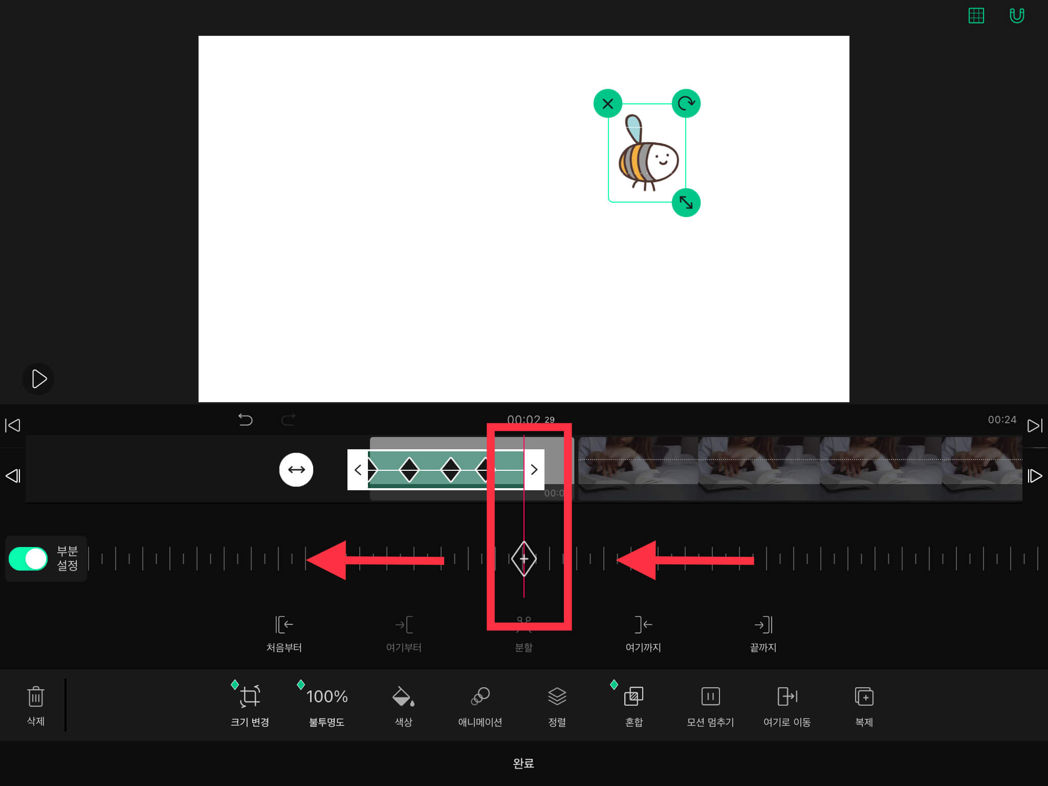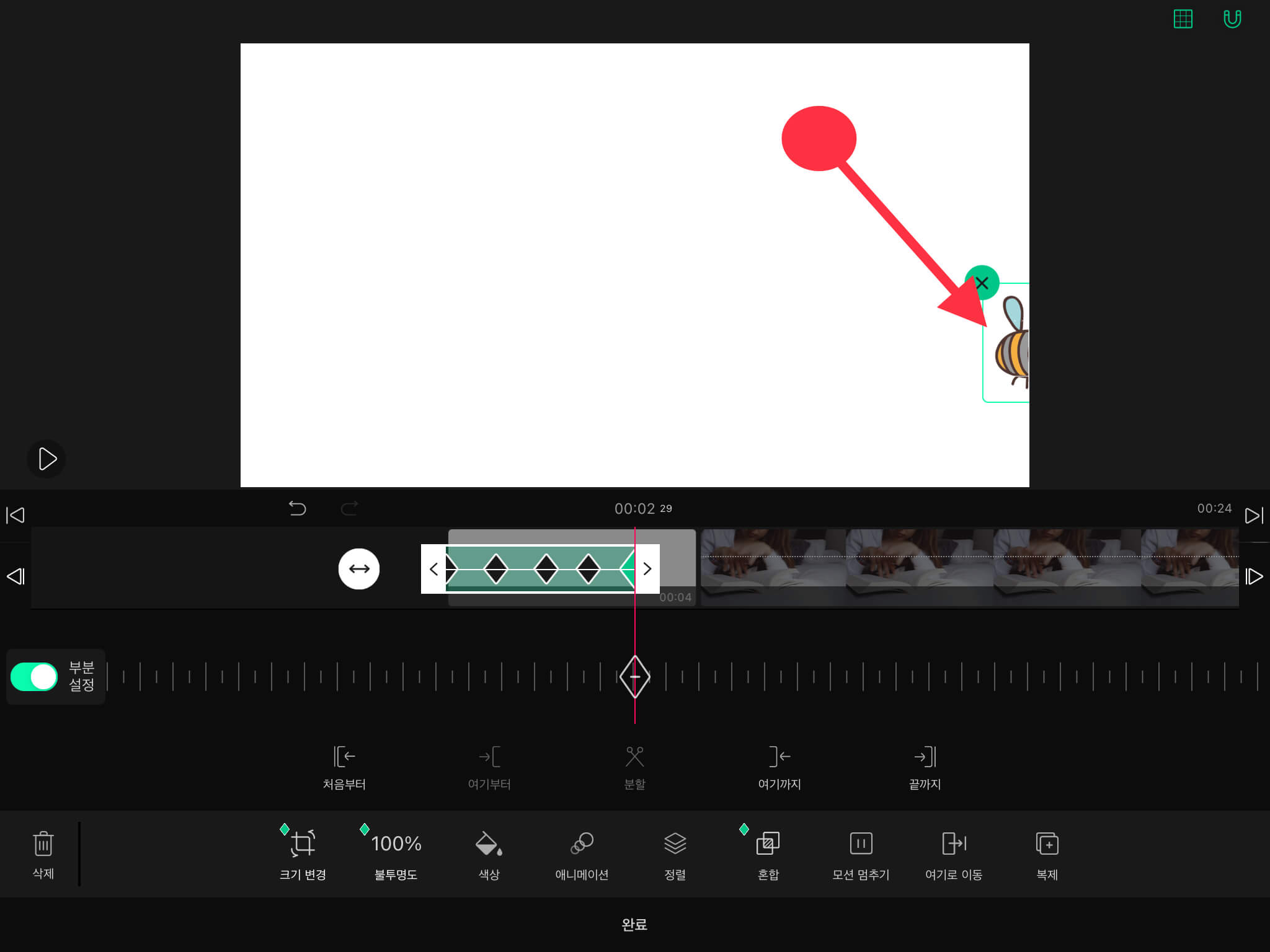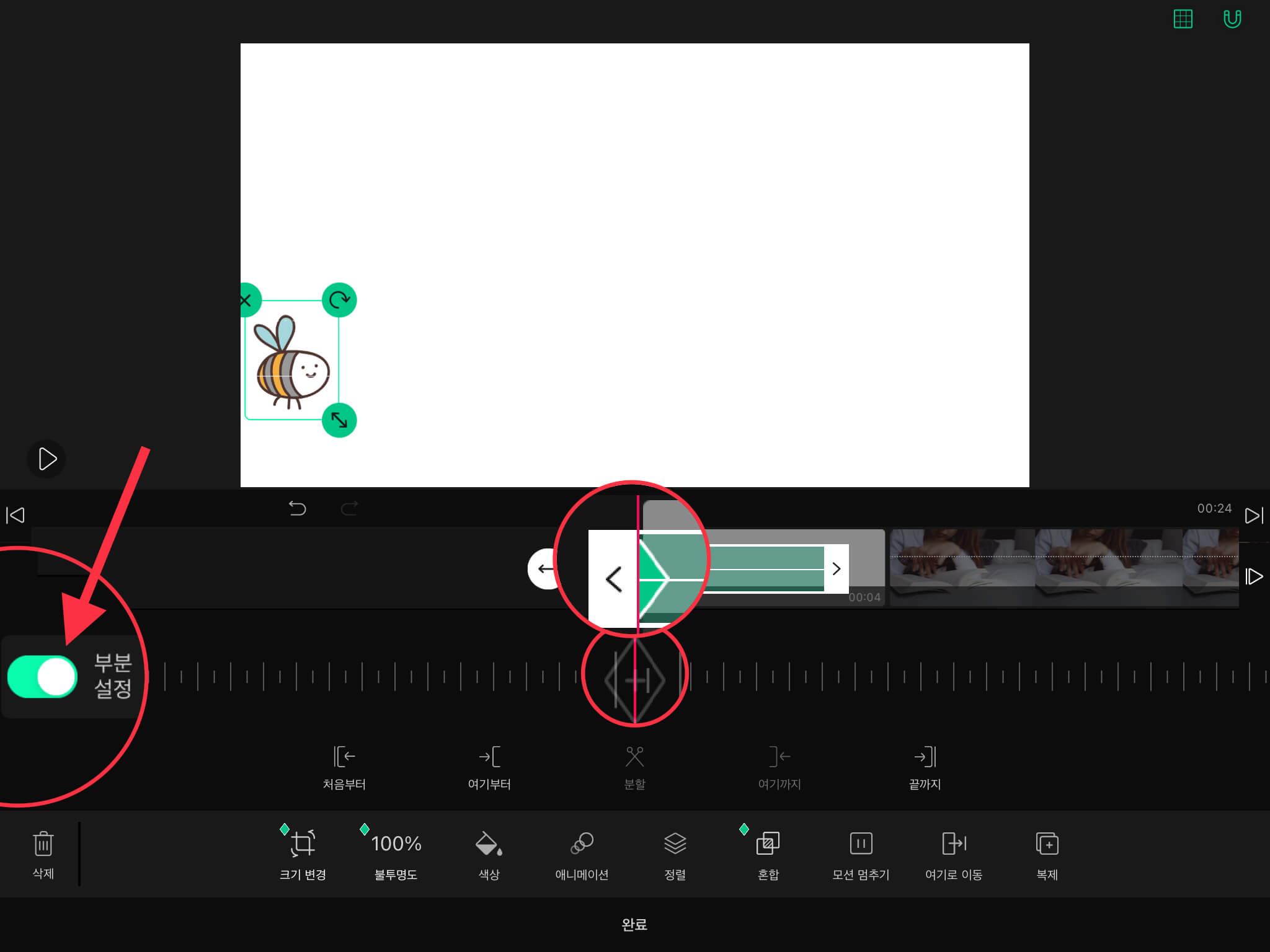 ▼ 그리고 왼쪽에 있는 [부분 설정]을 활성화시켜주세요. 그러면 스티커 타임라인에 아래와 같은 초록색 모양이 나옵니다.