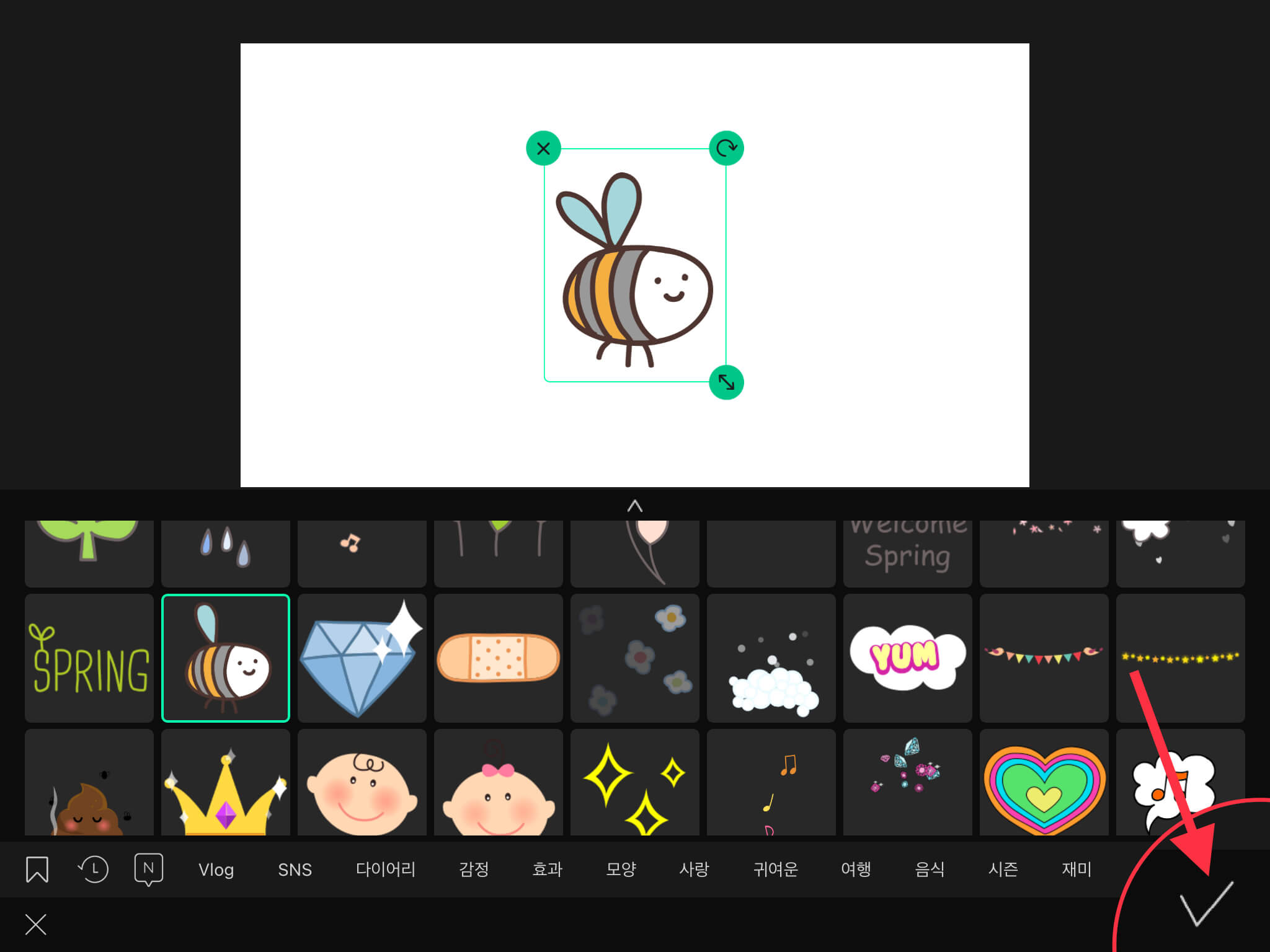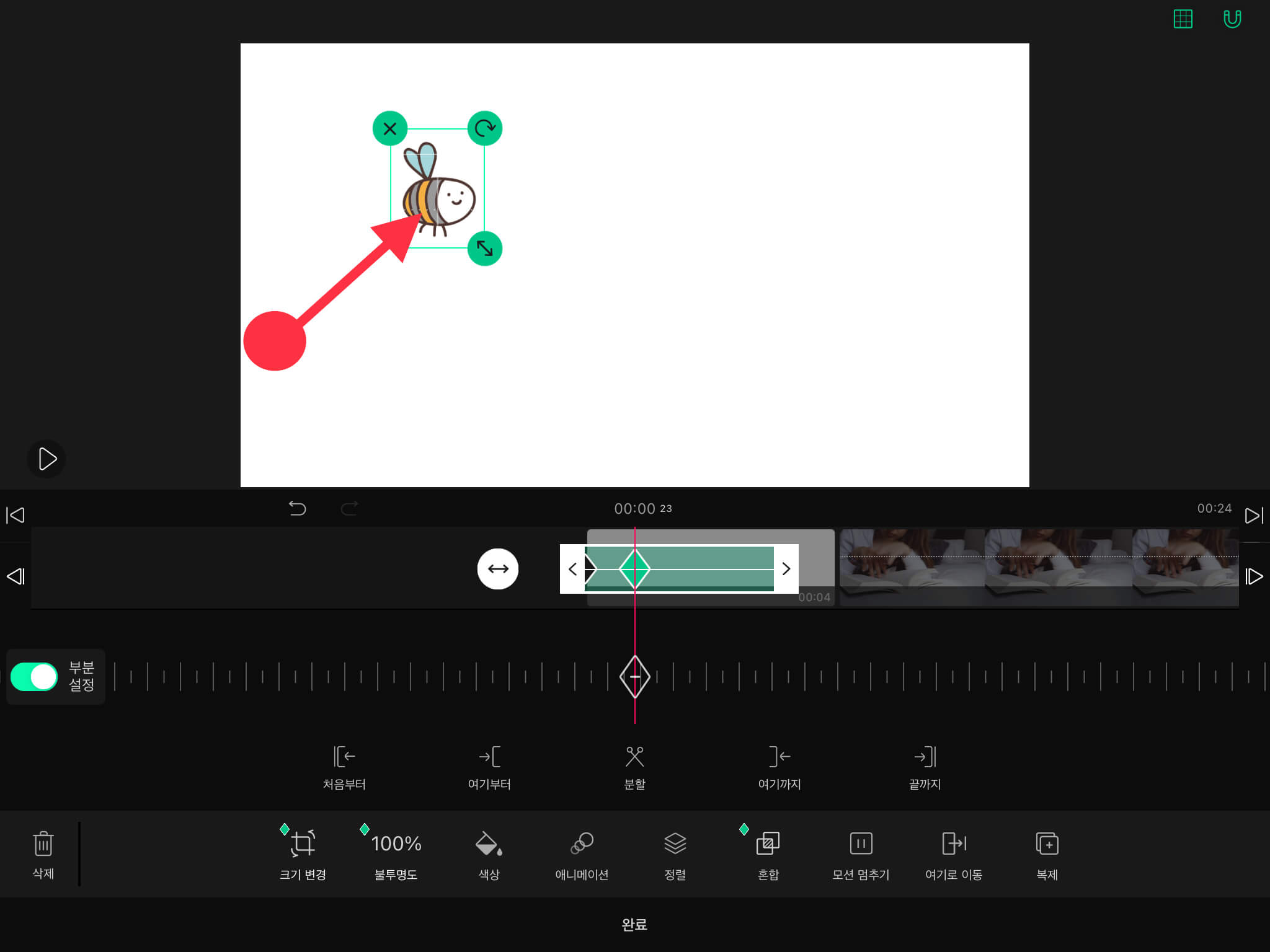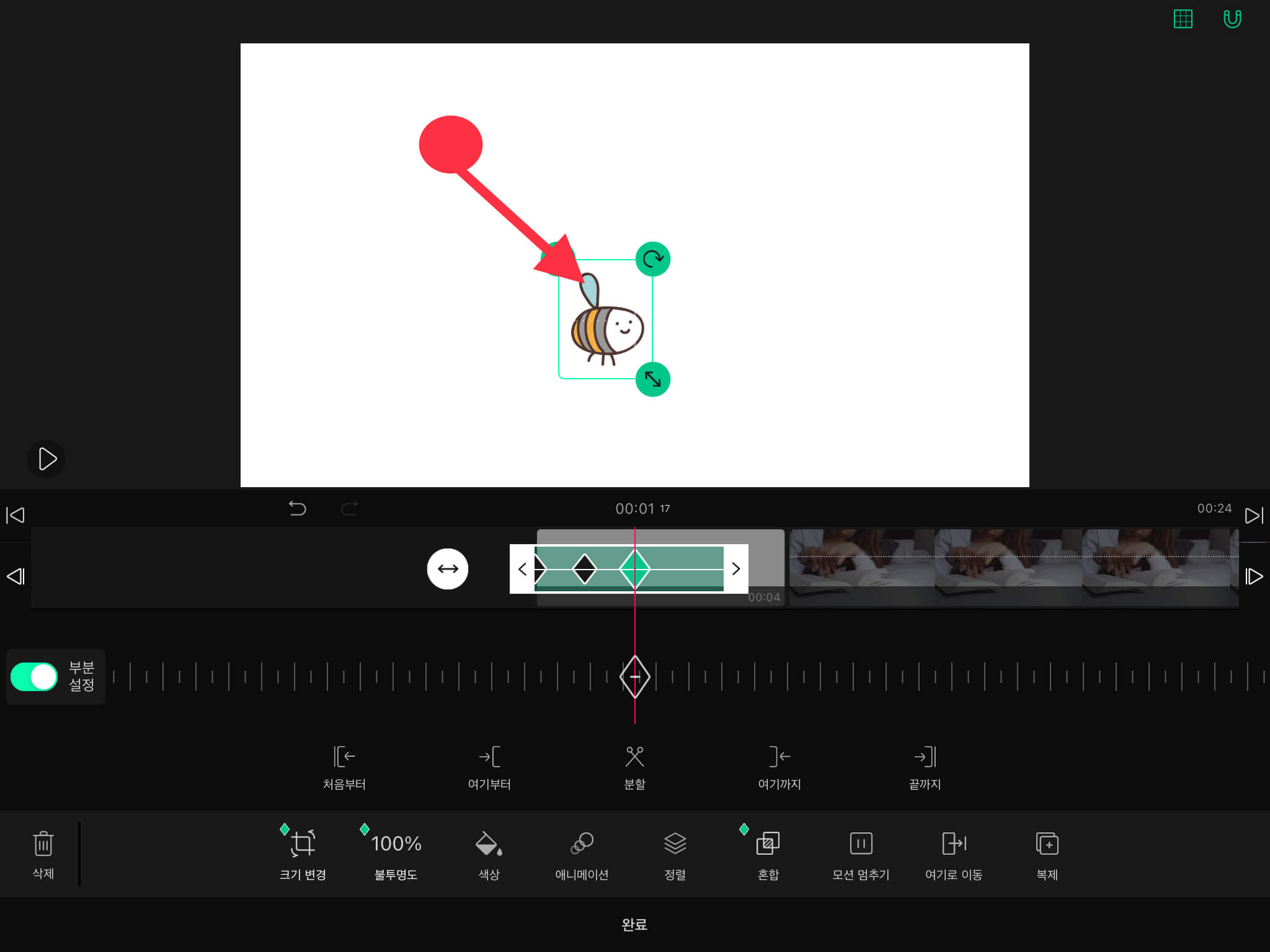▼ 벌 스티커 테두리에 있는 화살표 버튼을 이용해서 크기를 조정하고, 벌이 날아갈 시작 위치로 이동시켜주세요.