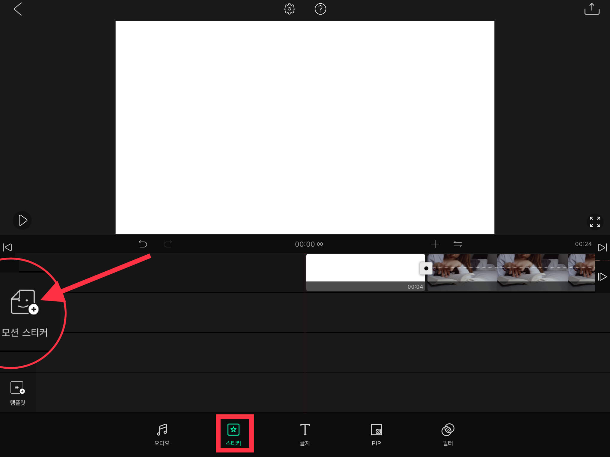 ▼ 먼저 블로에서 흰색 빈 화면을 넣어줍니다. (블로 vllo 흰색 빈 화면 넣는 방법 바로가기) 그리고 하단에 있는 [스티커] 메뉴를 누른 뒤, 왼쪽의 [모션 스티커]를 선택합니다.