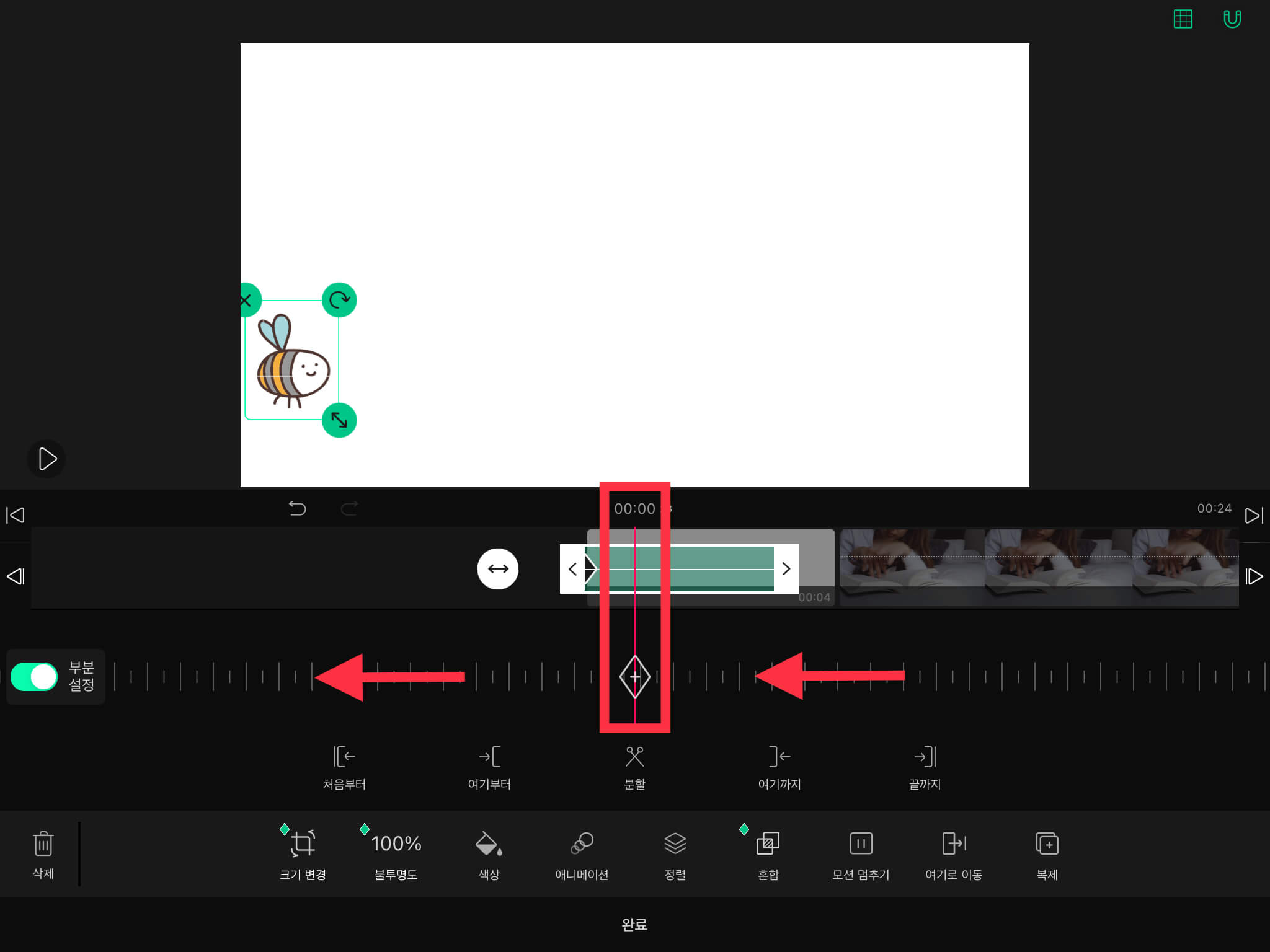 ▼ 그리고 왼쪽에 있는 [부분 설정]을 활성화시켜주세요. 그러면 스티커 타임라인에 아래와 같은 초록색 모양이 나옵니다.