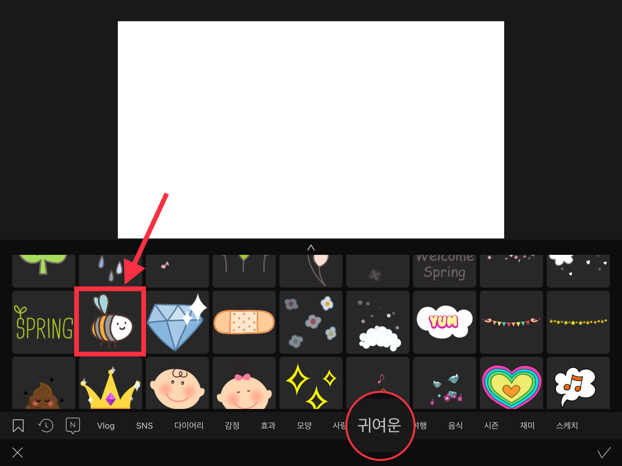 ▼ 모션 스티커 중에서 [귀여운]으로 들어간 뒤 [벌] 스티커를 선택합니다.
