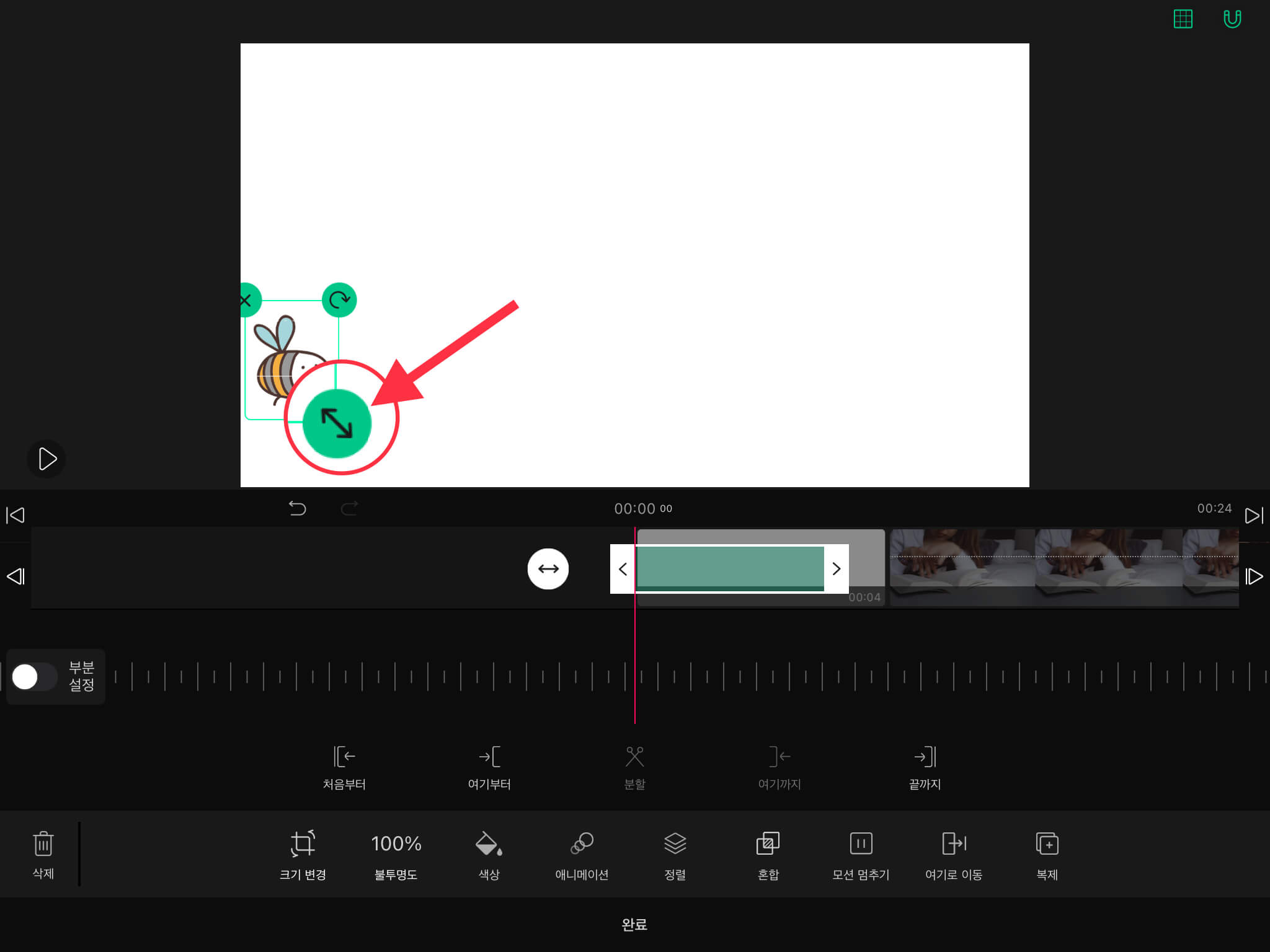 ▼ 벌 스티커 테두리에 있는 화살표 버튼을 이용해서 크기를 조정하고, 벌이 날아갈 시작 위치로 이동시켜주세요.