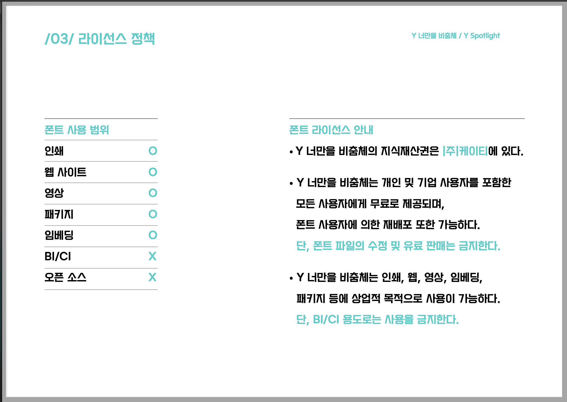 Y너만을 비춤체의 라이선스 정책은 아래와 같습니다. 지식재산권은 케이티에 있으며, 개인 및 기업 사용자를 포함한 모든 사용자에게 무료로 제공됩니다. 또한 인쇄, 웹, 영상, 임베딩, 패키지 등에 상업적 목적으로 사용이 가능합니다.
