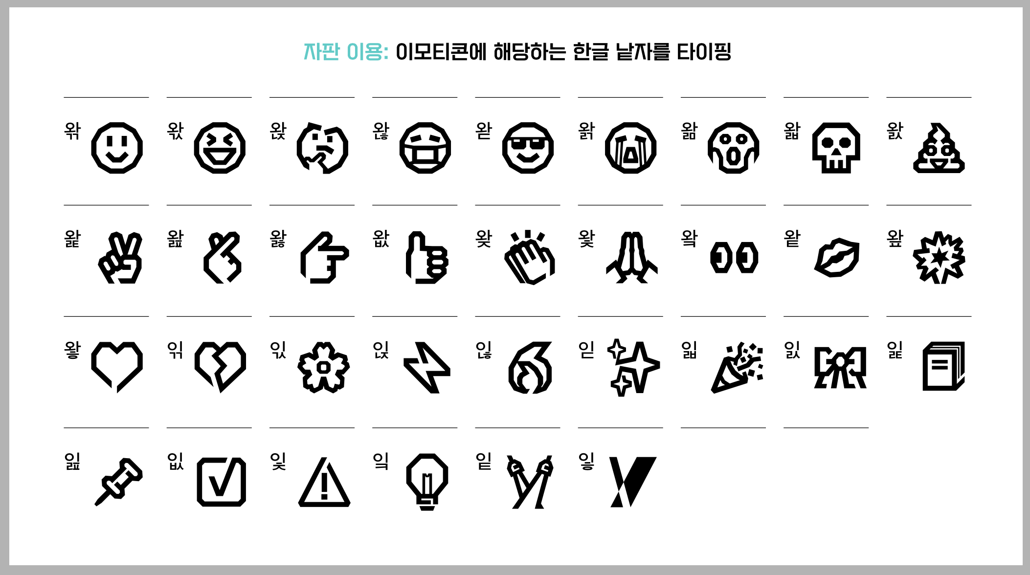 아래와 같이 자주 사용하지 않은 한글 낱자를 타이핑하면, 이모지가 나타나게 됩니다. 정말 개성있는 폰트인 것 같습니다.