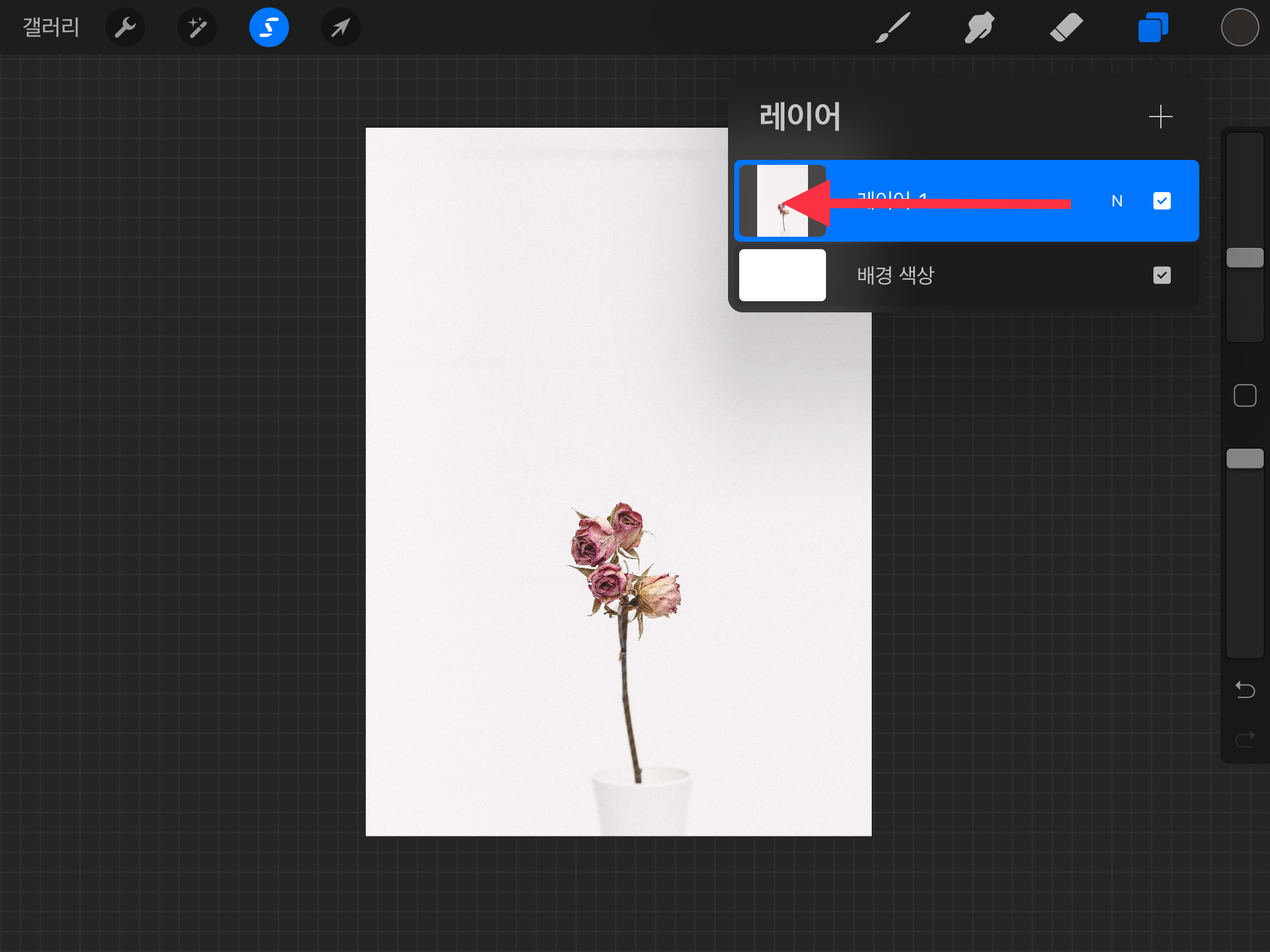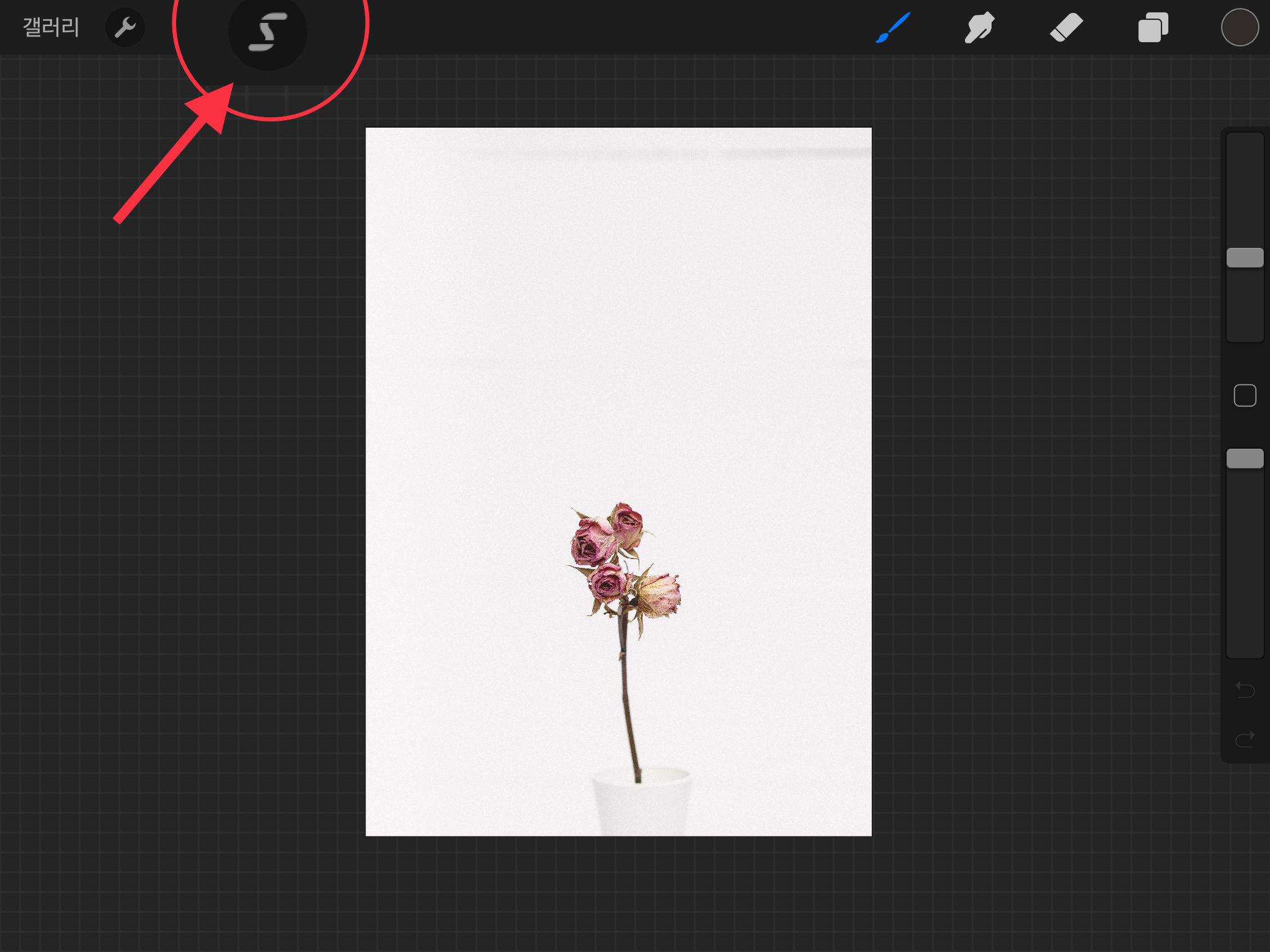 ▼ 아이패드 드로잉 어플인 프로크리에이트에서 배경 지우는 방법을 알아보겠습니다. 먼저 사진을 불러와주세요. (배경이 단색일수록 좋습니다) 그리고 왼쪽 상단에서 세 번째에 있는 [선택] 툴을 누릅니다.